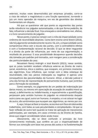 Rev. Trib. Reg. Trab. 3ª Reg., Belo Horizonte, v. 70, n. 110, p. 97-116, jul./dez. 2024106externos, muitas vezes desenvolvidos por empresas privadas, corre-se o risco de reduzir a magistratura a uma função operacional, tornando o juiz um mero operador de máquina, em vez de garantidor dos direitos fundamentais em disputa.Há que se questionar até que ponto os argumentos das partes terão relevância nos julgados automatizados, e de que forma poderão, de fato, influenciar a decisão final. Fica ameaçado o contraditório real, efetivo, e o livre convencimento do julgador.Nesse ponto, é preciso romper com o mito da imparcialidade como sinônimo de neutralidade absoluta. Como bem ensina Lenio Streck (2013), não há julgamento verdadeiramente neutro: há, sim, a imparcialidade como compromisso ético com a escuta das partes, com o contraditório efetivo e com a fundamentação racional da decisão. O que se deve resguardar é o direito da parte de influenciar, por meio de sua argumentação, o resultado do processo. E essa possibilidade desaparece quando decisões são tomadas por padrões pré-treinados, sem margem para a consideração das particularidades do caso.Ressalvam Nancy Andrighi e José Bianchi (2021), nesse sentido, que os juízes também recebem influência externa ao Direito de matriz social, econômica, ética e estética, que escapam, em primeiro momento, aos algoritmos. Essa influência, que rompe com a ideia estanque de neutralidade, não nos parece indesejada ou negativa: é apenas uma consequência das peculiaridades do humano. Afinal, a decisão judicial é uma das formas de representação do pensamento humano, que contribui para a formação da sociedade.Como exemplo, no julgamento de um pedido de indenização por danos morais, ou mesmo em apreciação de acusação de assédio moral ou sexual, o deferimento ou indeferimento, e especialmente a quantificação, perpassam pelo sentido humano do julgador no entendimento daquele outro como seu igual; outro ser humano. A empatia, e o se colocar no lugar do outro, são sentimentos que escapam aos algoritmos; ao menos por ora.E, aqui, há que se fazer a ressalva, se escreve com foco em demandas trabalhistas, com todas as suas peculiaridades e complexidades. Há que se fazer reflexão de outro tom quando se tratar de aplicação de mecanismos padronizados, por exemplo, em casos criminais ou de Direito de Família, áreas que exigem sensibilidade talvez ainda maior.Obviamente, não se deve confundir o princípio do livre convencimento motivado, que confere ao juiz a responsabilidade de formar sua convicção com base nas provas dos autos e na fundamentação