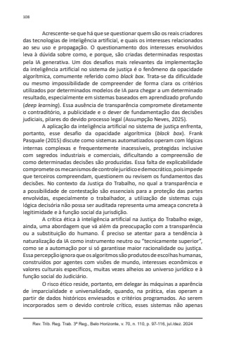Rev. Trib. Reg. Trab. 3ª Reg., Belo Horizonte, v. 70, n. 110, p. 97-116, jul./dez. 2024108Acrescente-se que há que se questionar quem são os reais criadores das tecnologias de inteligência artificial, e quais os interesses relacionados ao seu uso e propagação. O questionamento dos interesses envolvidos leva à dúvida sobre como, e porque, são criadas determinadas respostas pela IA generativa. Um dos desafios mais relevantes da implementação da inteligência artificial no sistema de justiça é o fenômeno da opacidade algorítmica, comumente referido como black box. Trata-se da dificuldade ou mesmo impossibilidade de compreender de forma clara os critérios utilizados por determinados modelos de IA para chegar a um determinado resultado, especialmente em sistemas baseados em aprendizado profundo (deep learning). Essa ausência de transparência compromete diretamente o contraditório, a publicidade e o dever de fundamentação das decisões judiciais, pilares do devido processo legal (Assumpção Neves, 2025).A aplicação da inteligência artificial no sistema de justiça enfrenta, portanto, esse desafio da opacidade algorítmica (black box). Frank Pasquale (2015) discute como sistemas automatizados operam com lógicas internas complexas e frequentemente inacessíveis, protegidas inclusive com segredos industriais e comerciais, dificultando a compreensão de como determinadas decisões são produzidas. Essa falta de explicabilidade compromete os mecanismos de controle jurídico e democrático, pois impede que terceiros compreendam, questionem ou revisem os fundamentos das decisões. No contexto da Justiça do Trabalho, no qual a transparência e a possibilidade de contestação são essenciais para a proteção das partes envolvidas, especialmente o trabalhador, a utilização de sistemas cuja lógica decisória não possa ser auditada representa uma ameaça concreta à legitimidade e à função social da jurisdição.A crítica ética à inteligência artificial na Justiça do Trabalho exige, ainda, uma abordagem que vá além da preocupação com a transparência ou a substituição do humano. É preciso se atentar para a tendência à naturalização da IA como instrumento neutro ou “tecnicamente superior”, como se a automação por si só garantisse maior racionalidade ou justiça. Essa percepção ignora que os algoritmos são produtos de escolhas humanas, construídos por agentes com visões de mundo, interesses econômicos e valores culturais específicos, muitas vezes alheios ao universo jurídico e à função social do Judiciário.O risco ético reside, portanto, em delegar às máquinas a aparência de imparcialidade e universalidade, quando, na prática, elas operam a partir de dados históricos enviesados e critérios programados. Ao serem incorporados sem o devido controle crítico, esses sistemas não apenas