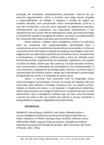 Rev. Trib. Reg. Trab. 3ª Reg., Belo Horizonte, v. 70, n. 110, p. 97-116, jul./dez. 2024113produção de resultados estatisticamente previsíveis. Trata-se de um exercício argumentativo, crítico e sensível, que exige escuta, empatia e responsabilidade. Ao delegar à máquina a função de sugerir ou modelar decisões, sem pensamento crítico correspondente, corre-se o risco de transformar o juiz em mero operador de plataformas técnicas, enfraquecendo sua autonomia, sua capacidade interpretativa e seu compromisso com o justo. Não se pode ignorar, ainda, que toda tecnologia é socialmente situada e carregada de valores, servindo a um determinado fim, ainda que não esteja claro qual para os consumidores.Nesse cenário, o debate sobre inteligência artificial no Judiciário deve ser conduzido com responsabilidade, sensibilidade ética e compromisso com os fundamentos democráticos da jurisdição. A crítica ao uso acrítico da IA não implica a rejeição do progresso tecnológico, mas sim a exigência de sua submissão a parâmetros normativos claros, transparentes e participativos. A inteligência artificial pode e deve ser utilizada como ferramenta auxiliar, especialmente em atividades repetitivas e de suporte à análise de dados, desde que não substitua a função decisória humana, nem comprometa a efetividade do contraditório e da fundamentação. O uso consciente e regulado da tecnologia pode, inclusive, contribuir para a racionalização do trabalho judicial, desde que subordinado à preservação da dignidade das partes e à realização da justiça social.Assim, o caminho mais promissor está na integração crítica entre tecnologia e humanidade. O futuro da Justiça do Trabalho não será construído pela rejeição à inovação, tampouco por sua adoção acrítica. Caberá ao sistema de Justiça, e, em especial, à magistratura trabalhista, liderar esse processo com coragem institucional, compromisso ético e visão democrática. Que a inteligência artificial seja, de fato, uma ferramenta a serviço do justo, e não um modelo que silencie a escuta, invisibilize a desigualdade ou apague a dignidade do jurisdicionado.REFERÊNCIASANDRIGHI, Fátima Nancy; BIANCHI, José Flávio. Reflexão sobre o uso da inteligência artificial ao processo de tomada de decisões no Poder Judiciário. In: PINTO, Henrique Alves; GUEDES, Jefferson Carús; CERQUEIRA CÉSAR, Joaquim Potes de (coord.). Inteligência artificial aplicada ao processo de tomada de decisões. Belo Horizonte; São Paulo: D’Plácido, 2021. 748 p.