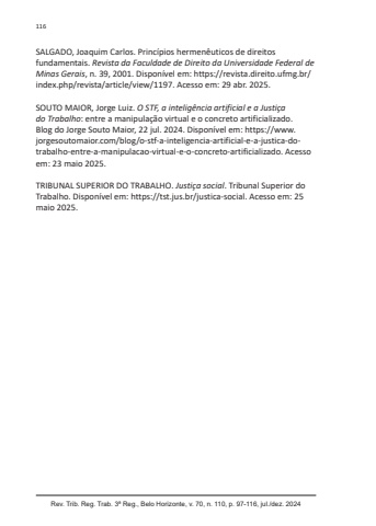 Rev. Trib. Reg. Trab. 3ª Reg., Belo Horizonte, v. 70, n. 110, p. 97-116, jul./dez. 2024116SALGADO, Joaquim Carlos. Princípios hermenêuticos de direitos fundamentais. Revista da Faculdade de Direito da Universidade Federal de Minas Gerais, n. 39, 2001. Disponível em: https://revista.direito.ufmg.br/index.php/revista/article/view/1197. Acesso em: 29 abr. 2025.SOUTO MAIOR, Jorge Luiz. O STF, a inteligência artificial e a Justiça do Trabalho: entre a manipulação virtual e o concreto artificializado. Blog do Jorge Souto Maior, 22 jul. 2024. Disponível em: https://www.jorgesoutomaior.com/blog/o-stf-a-inteligencia-artificial-e-a-justica-dotrabalho-entre-a-manipulacao-virtual-e-o-concreto-artificializado. Acesso em: 23 maio 2025.TRIBUNAL SUPERIOR DO TRABALHO. Justiça social. Tribunal Superior do Trabalho. Disponível em: https://tst.jus.br/justica-social. Acesso em: 25 maio 2025.