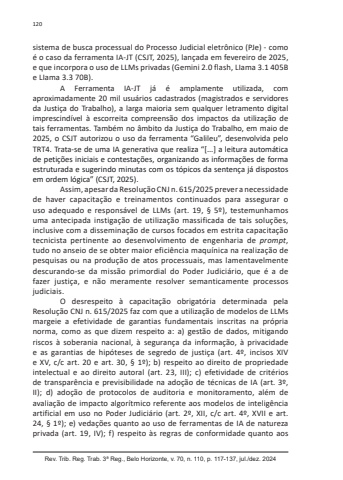 Rev. Trib. Reg. Trab. 3ª Reg., Belo Horizonte, v. 70, n. 110, p. 117-137, jul./dez. 2024120sistema de busca processual do Processo Judicial eletrônico (PJe) - como é o caso da ferramenta IA-JT (CSJT, 2025), lançada em fevereiro de 2025, e que incorpora o uso de LLMs privadas (Gemini 2.0 flash, LIama 3.1 405B e LIama 3.3 70B).A Ferramenta IA-JT já é amplamente utilizada, com aproximadamente 20 mil usuários cadastrados (magistrados e servidores da Justiça do Trabalho), a larga maioria sem qualquer letramento digital imprescindível à escorreita compreensão dos impactos da utilização de tais ferramentas. Também no âmbito da Justiça do Trabalho, em maio de 2025, o CSJT autorizou o uso da ferramenta “Galileu”, desenvolvida pelo TRT4. Trata-se de uma IA generativa que realiza “[...] a leitura automática de petições iniciais e contestações, organizando as informações de forma estruturada e sugerindo minutas com os tópicos da sentença já dispostos em ordem lógica” (CSJT, 2025).Assim, apesar da Resolução CNJ n. 615/2025 prever a necessidade de haver capacitação e treinamentos continuados para assegurar o uso adequado e responsável de LLMs (art. 19, § 5º), testemunhamos uma antecipada instigação de utilização massificada de tais soluções, inclusive com a disseminação de cursos focados em estrita capacitação tecnicista pertinente ao desenvolvimento de engenharia de prompt, tudo no anseio de se obter maior eficiência maquínica na realização de pesquisas ou na produção de atos processuais, mas lamentavelmente descurando-se da missão primordial do Poder Judiciário, que é a de fazer justiça, e não meramente resolver semanticamente processos judiciais.O desrespeito à capacitação obrigatória determinada pela Resolução CNJ n. 615/2025 faz com que a utilização de modelos de LLMs margeie a efetividade de garantias fundamentais inscritas na própria norma, como as que dizem respeito a: a) gestão de dados, mitigando riscos à soberania nacional, à segurança da informação, à privacidade e as garantias de hipóteses de segredo de justiça (art. 4º, incisos XIV e XV, c/c art. 20 e art. 30, § 1º); b) respeito ao direito de propriedade intelectual e ao direito autoral (art. 23, III); c) efetividade de critérios de transparência e previsibilidade na adoção de técnicas de IA (art. 3º, II); d) adoção de protocolos de auditoria e monitoramento, além de avaliação de impacto algorítmico referente aos modelos de inteligência artificial em uso no Poder Judiciário (art. 2º, XII, c/c art. 4º, XVII e art. 24, § 1º); e) vedações quanto ao uso de ferramentas de IA de natureza privada (art. 19, IV); f) respeito às regras de conformidade quanto aos