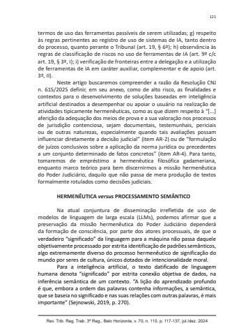 Rev. Trib. Reg. Trab. 3ª Reg., Belo Horizonte, v. 70, n. 110, p. 117-137, jul./dez. 2024121termos de uso das ferramentas passíveis de serem utilizadas; g) respeito às regras pertinentes ao registro de uso de sistemas de IA, tanto dentro do processo, quanto perante o Tribunal (art. 19, § 6º); h) observância às regras de classificação de riscos no uso de ferramentas de IA (art. 9º c/c art. 19, § 3º, I); i) verificação de fronteiras entre a delegação e a utilização de ferramentas de IA em caráter auxiliar, complementar e de apoio (art. 3º, II).Neste artigo buscaremos compreender a razão da Resolução CNJ n. 615/2025 definir, em seu anexo, como de alto risco, as finalidades e contextos para o desenvolvimento de soluções baseadas em inteligência artificial destinados a desempenhar ou apoiar o usuário na realização de atividades tipicamente hermenêuticas, como as que dizem respeito à “[...] aferição da adequação dos meios de prova e a sua valoração nos processos de jurisdição contenciosa, sejam documentais, testemunhais, periciais ou de outras naturezas, especialmente quando tais avaliações possam influenciar diretamente a decisão judicial” (item AR-2) ou de “formulação de juízos conclusivos sobre a aplicação da norma jurídica ou precedentes a um conjunto determinado de fatos concretos” (item AR-4). Para tanto, tomaremos de empréstimo a hermenêutica filosófica gadameriana, enquanto marco teórico para bem discernirmos a missão hermenêutica do Poder Judiciário, daquilo que não passa de mera produção de textos formalmente rotulados como decisões judiciais.HERMENÊUTICA versus PROCESSAMENTO SEMÂNTICONa atual conjuntura de disseminação irrefletida de uso de modelos de linguagem de larga escala (LLMs), podemos afirmar que a preservação da missão hermenêutica do Poder Judiciário dependerá da formação de consciência, por parte dos atores processuais, de que o verdadeiro “significado” da linguagem para a máquina não passa daquele objetivamente processado por estrita identificação de padrões semânticos, algo extremamente diverso do processo hermenêutico de significação do mundo por seres de cultura, únicos dotados de intencionalidade moral.Para a inteligência artificial, o texto datificado de linguagem humana denota “significado” por estrita conexão objetiva de dados, na inferência semântica de um contexto. “A lição do aprendizado profundo é que, embora a ordem das palavras contenha informações, a semântica, que se baseia no significado e nas suas relações com outras palavras, é mais importante” (Sejnowski, 2019, p. 270).
