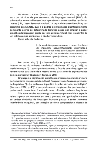 Rev. Trib. Reg. Trab. 3ª Reg., Belo Horizonte, v. 70, n. 110, p. 117-137, jul./dez. 2024122Os textos tratados (limpos, processados, marcados, agrupados etc.) por técnicas de processamento de linguagem natural (PLN1) são submetidos a uma análise semântica por técnicas como a análise semântica latente (LSA, Latent Semantic Analysis). A capacidade de se identificar, por escrutínio do big data, qual é o padrão de informação quantitativamente dominante acerca de determinada temática acaba por ampliar o poder simbólico da linguagem gerida por inteligência artificial, mas isso dentro de um estrito campo semântico, e não hermenêutico.Como salienta Gadamer,[...] a semântica parece descrever o campo dos dados de linguagem (Gegebenheistsfeld), observando-o desde fora, de tal modo que é possível desenvolver uma classificação dos modos de comportamento no trato com esses signos (Gadamer, 2021b, p. 205).Por outro lado, “[...] a hermenêutica ocupa-se com o aspecto interno no uso do universo semântico” (Gadamer, 2021b, p. 205), na medida em que “[...] toma por fundamento o fato de que a linguagem nos remete tanto para além dela mesma como para além da expressividade que ela apresenta” (Gadamer, 2021b, p. 209).Linguagem e significação simbólica representam a matriz primária do humanismo enquanto dado cultural. Nas palavras de Saussure, precursor da linguística, “[...] o problema linguístico é, antes de tudo, semiológico” (Saussure, 2012, p. 49)2, a que poderíamos complementar que também o problema do humanismo é, antes de tudo, cultural e, portanto, linguístico.Tais advertências assumem grande contemporaneidade e especial relevo a partir do momento em que o processo de significação inerente ao caráter simbólico da linguagem humana passou a sofrer relevante interferência maquinal, por atuação de força computacional dotada de 1 O desenvolvimento da PLN (ou NLP, Natural Language Processing) ganhou novo status com a aprendizagem profunda da máquina. Como esclarece Taulli, estamos experimentando “[...] grandes avanços com NLP, como visto em aplicativos como Siri, Alexa e Cortana. Grande parte do progresso também aconteceu na última década, impulsionada pelo poder do deep learning” (Taulli, 2020, p. 137). 2 Ao tratar da Semiologia (do grego semeion, “signo”) e da Linguística, Saussure já esclarecia que a “Linguística não é senão uma parte dessa ciência geral; as leis que a Semiologia descobrir serão aplicáveis à Linguística” (Saussure, 2012, p. 48).