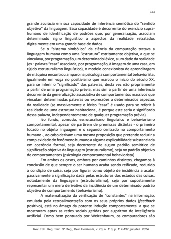 Rev. Trib. Reg. Trab. 3ª Reg., Belo Horizonte, v. 70, n. 110, p. 117-137, jul./dez. 2024123grande acurácia em sua capacidade de inferência semiótica do “sentido objetivo” da linguagem. Essa capacidade é decorrente do exercício suprahumano de identificação de padrões que, por generalização, associam determinado signo linguístico a aspectos da realidade retratados digitalmente em uma grande base de dados.Se o “sistema simbólico” da ciência da computação tratava a linguagem humana como uma “estrutura” estritamente objetiva, a que se vinculava, por programação, um determinado léxico, a um dado da realidade (ex.: palavra “casa” associada, por programação, à imagem de uma casa, em rígido estruturalismo linguístico), o modelo conexionista de aprendizagem de máquina encontrou amparo na psicologia comportamental behaviorista, igualmente em voga no positivismo que marcou o início do século XX, para se inferir o “significado” das palavras, desta vez não propriamente a partir de uma programação prévia, mas sim a partir de uma inferência decorrente da generalização associativa de comportamentos massivos que vinculam determinadas palavras ou expressões a determinados aspectos da realidade (se massivamente o léxico “casa” é usado para se referir à realidade de uma estrutura habitacional, é porque este seria o significado dessa palavra, independentemente de qualquer programação prévia).No fundo, contudo, estruturalismo linguístico e behaviorismo comportamental, apesar de partirem de premissas distintas - o primeiro focado no objeto linguagem e o segundo centrado no comportamento humano -, ao cabo derivam uma mesma proposição que pretende reduzir a complexidade do fenômeno humano a alguma explicabilidade substanciada em coerência formal, seja decorrente de algum padrão semiótico de significação objetiva da linguagem (estruturalismo), seja no padrão objetivo de comportamentos (psicologia comportamental behaviorista).Em ambos os casos, embora por caminhos distintos, chegamos à conclusão de que sempre o ser humano acaba sendo reificado, reduzido à condição de coisa, seja por figurar como objeto de incidência a acatar passivamente a significação dada pelas estruturas dos estados das coisas, notadamente da linguagem (estruturalismo), seja por supostamente representar um mero derivativo da incidência de um determinado padrão objetivo de comportamento (behaviorismo).A matematização da verificação de “constantes” na informação, emulada pela retroalimentação com os seus próprios dados (feedbackpositivo), está no âmago da potente indução comportamental a que se mostraram aptas as redes sociais geridas por algoritmo de inteligência artificial. Como bem pontuado por Weizenbaum, os computadores são