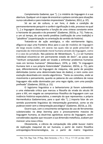 Rev. Trib. Reg. Trab. 3ª Reg., Belo Horizonte, v. 70, n. 110, p. 117-137, jul./dez. 2024127Complementa Gadamer, que “[...] o mistério da linguagem é a sua abertura. Qualquer um é capaz de encontrar a palavra correta para situações nunca calculáveis e para instantes imprevisíveis” (Gadamer, 2012, p. 37).Só ao ser de cultura, o ser livre, é dada a condição de permanentemente perquirir e conferir significação à vida, processo no qual “[...] a linguagem desempenha a função de uma síntese constante entre o horizonte do passado e do presente” (Gadamer, 2021b, p. 71). Trata-se, a um só tempo, de uma tarefa preditiva (ratificação de uma tradição) e “pósditiva” (coparticipação na orientação do sentido da história).Tratando-se de ação axiológica, e não estritamente lógica, afigura-se aqui uma fronteira ética para o uso de modelos de linguagem de larga escala (LLMs), em searas nas quais não se pode prescindir da expressão da intencionalidade moral humana através da linguagem, como é o caso da jurisdição. Nas palavras de Weizenbaum, “[...] o ser humano individual encontra-se em permanente estado de devir”, ao passo que “nenhum computador pode ser levado a enfrentar problemas humanos reais em termos humanos” (Weizenbaun, 1976, p. 240). “A Linguagem Humana tem a sua própria historicidade” (Gadamer, 2021b, p. 71), pelo que, diferentemente da linguagem de máquina, não parte de posições delimitadas (como uma determinada base de dados), e nem conta com evolução desenhada em receita algorítmica. “Tanto os conceitos, onde se movimenta o pensamento, quanto as palavras do uso cotidiano de nossa linguagem não estão dominados por uma regra rígida, com uma posição prefixada” (Gadamer, 2021b, p. 21).O logicismo linguístico e o behaviorismo já foram submetidos a uma elaborada crítica que marcou a filosofia da virada do século XX para o XXI, em resgate ao compromisso filosófico da linguagem com sua instância histórico-especulativa, a exemplo do que representou a própria Hermenêutica Gadameriana, para a qual não “[...] importa falar de um sentido puramente linguístico da interpretação gramatical, como se ela pudesse existir sem a interpretação psicológica” (Gadamer, 2021b, p. 23).Ocorre que, com o crescimento vertiginoso do uso de ferramentas substanciadas na deep learning para o processamento massivo da linguagem humana, as doutrinas agnósticas acerca da linguagem, assim consideradas aquelas que recusam a sua dimensão metafísica, acabam por merecer uma nova crítica.Obviamente, a ciência da computação não pôde buscar matriz de replicação maquinal do ser humano, a partir de matriz filosófica antropológico-fenomenológica, ou a partir de matriz linguística