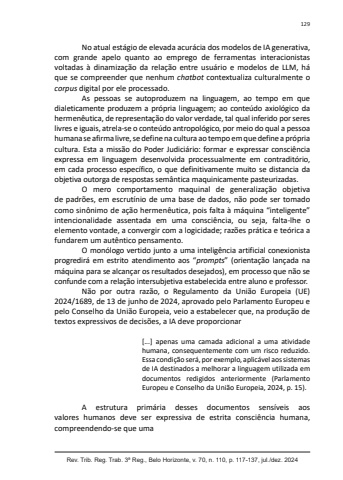 Rev. Trib. Reg. Trab. 3ª Reg., Belo Horizonte, v. 70, n. 110, p. 117-137, jul./dez. 2024129No atual estágio de elevada acurácia dos modelos de IA generativa, com grande apelo quanto ao emprego de ferramentas interacionistas voltadas à dinamização da relação entre usuário e modelos de LLM, há que se compreender que nenhum chatbot contextualiza culturalmente o corpus digital por ele processado.As pessoas se autoproduzem na linguagem, ao tempo em que dialeticamente produzem a própria linguagem; ao conteúdo axiológico da hermenêutica, de representação do valor verdade, tal qual inferido por seres livres e iguais, atrela-se o conteúdo antropológico, por meio do qual a pessoa humana se afirma livre, se define na cultura ao tempo em que define a própria cultura. Esta a missão do Poder Judiciário: formar e expressar consciência expressa em linguagem desenvolvida processualmente em contraditório, em cada processo específico, o que definitivamente muito se distancia da objetiva outorga de respostas semântica maquinicamente pasteurizadas.O mero comportamento maquinal de generalização objetiva de padrões, em escrutínio de uma base de dados, não pode ser tomado como sinônimo de ação hermenêutica, pois falta à máquina “inteligente” intencionalidade assentada em uma consciência, ou seja, falta-lhe o elemento vontade, a convergir com a logicidade; razões prática e teórica a fundarem um autêntico pensamento.O monólogo vertido junto a uma inteligência artificial conexionista progredirá em estrito atendimento aos “prompts” (orientação lançada na máquina para se alcançar os resultados desejados), em processo que não se confunde com a relação intersubjetiva estabelecida entre aluno e professor.Não por outra razão, o Regulamento da União Europeia (UE) 2024/1689, de 13 de junho de 2024, aprovado pelo Parlamento Europeu e pelo Conselho da União Europeia, veio a estabelecer que, na produção de textos expressivos de decisões, a IA deve proporcionar[...] apenas uma camada adicional a uma atividade humana, consequentemente com um risco reduzido. Essa condição será, por exemplo, aplicável aos sistemas de IA destinados a melhorar a linguagem utilizada em documentos redigidos anteriormente (Parlamento Europeu e Conselho da União Europeia, 2024, p. 15).A estrutura primária desses documentos sensíveis aos valores humanos deve ser expressiva de estrita consciência humana, compreendendo-se que uma