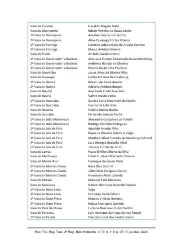Rev. Trib. Reg. Trab. 3ª Reg., Belo Horizonte, v. 70, n. 110, p. 07-17, jul./dez. 2024Vara de Curvelo Geraldo Magela MeloVara de Diamantina Edson Ferreira de Souza Júnior1ª Vara de Divinópolis Anselmo Bosco dos Santos2ª Vara de Divinópolis Aline Queiroga Fortes Ribeiro1ª Vara de Formiga Carolina Lobato Goes de Araújo Barroso2ª Vara de Formiga Marco Antônio SilveiraVara de Frutal Arlindo Cavalaro Neto1ª Vara de Governador Valadares Ana Luiza Fischer Teixeira de Souza Mendonça2ª Vara de Governador Valadares Andressa Batista de Oliveira3ª Vara de Governador Valadares Priscila Rajão Cota PachecoVara de Guanhães Josias Alves da Silveira FilhoVara de Guaxupé Carlos Adriano Dani Lebourg1ª Vara de Itabira Renato de Paula Amado2ª Vara de Itabira Adriano Antônio BorgesVara de Itajubá Ana Paula Costa GuerzoniVara de Itaúna Valmir Inácio Vieira1ª Vara de Ituiutaba Sandra Carla Simamoto da Cunha2ª Vara de Ituiutaba Camilo de Lelis SilvaVara de Iturama Helena Honda RochaVara de Januária Fernando Saraiva Rocha1ª Vara de João Monlevade Alexandre Gonçalves de Toledo2ª Vara de João Monlevade Rodrigo Cândido Rodrigues1ª Vara de Juiz de Fora Agnaldo Amado Filho2ª Vara de Juiz de Fora Keyla de Oliveira Toledo e Veiga3ª Vara de Juiz de Fora Martha Halfeld Furtado de Mendonça Schmidt4ª Vara de Juiz de Fora Luiz Olympio Brandão Vidal5ª Vara de Juiz de Fora Tarcísio Corrêa de BritoVara de Lavras Paulo Emílio Vilhena da SilvaVara de Manhuaçu Hitler Eustásio Machado OliveiraVara de Monte Azul Henrique de Souza Mota1ª Vara de Montes Claros Rosa Dias Godrim2ª Vara de Montes Claros Júlio César Cangussu Souto3ª Vara de Montes Claros Neurisvan Alves LacerdaVara de Muriaé Marcelo Paes MenezesVara de Nanuque Nelson Henrique Rezende Pereira1ª Vara de Nova Lima Vaga2ª Vara de Nova Lima Cristiano Daniel Muzzi1ª Vara de Ouro Preto Marcos Vinícius Barroso2ª Vara de Ouro Preto Raíssa Rodrigues GomideVara de Pará de Minas Luciana Nascimento dos SantosVara de Paracatu Luís Henrique Santiago Santos Rangel1ª Vara de Passos Francisco José dos Santos Júnior
