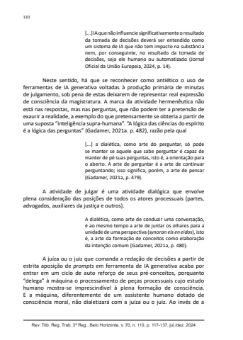 Rev. Trib. Reg. Trab. 3ª Reg., Belo Horizonte, v. 70, n. 110, p. 117-137, jul./dez. 2024130[...] IA que não influencie significativamente o resultado da tomada de decisões deverá ser entendido como um sistema de IA que não tem impacto na substância nem, por conseguinte, no resultado da tomada de decisões, seja ele humano ou automatizado (Jornal Oficial da União Europeia, 2024, p. 14).Neste sentido, há que se reconhecer como antiético o uso de ferramentas de IA generativa voltadas à produção primária de minutas de julgamento, sob pena de estas deixarem de representar real expressão de consciência da magistratura. A marca da atividade hermenêutica não está nas respostas, mas nas perguntas, que não podem ter a pretensão de exaurir a realidade, a exemplo do que pretensamente se obteria a partir de uma suposta “inteligência supra-humana”. “A lógica das ciências do espírito é a lógica das perguntas” (Gadamer, 2021a. p. 482), razão pela qual[...] a dialética, como arte do perguntar, só pode se manter se aquele que sabe perguntar é capaz de manter de pé suas perguntas, isto é, a orientação para o aberto. A arte de perguntar é a arte de continuar perguntando; isso significa, porém, a arte de pensar (Gadamer, 2021a, p. 479).A atividade de julgar é uma atividade dialógica que envolve plena consideração das posições de todos os atores processuais (partes, advogados, auxiliares da justiça e outros).A dialética, como arte de conduzir uma conversação, é ao mesmo tempo a arte de juntar os olhares para a unidade de uma perspectiva (synoran eis en eidos), isto é, a arte da formação de conceitos como elaboração da intenção comum (Gadamer, 2021a, p. 480).A juíza ou o juiz que comanda a redação de decisões a partir de estrita aposição de prompts em ferramenta de IA generativa acaba por entrar em um ciclo de auto reforço de seus pré-conceitos, porquanto “delega” à máquina o processamento de peças processuais cujo estudo humano mostra-se imprescindível à plena formação de consciência. E a máquina, diferentemente de um assistente humano dotado de consciência moral, não dialetizará com a juíza ou o juiz. Ao invés de a