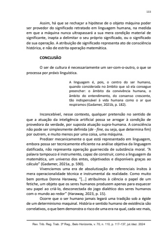 Rev. Trib. Reg. Trab. 3ª Reg., Belo Horizonte, v. 70, n. 110, p. 117-137, jul./dez. 2024133Assim, há que se rechaçar a hipótese de o objeto máquina poder ser provedor do significado retratado em linguagem humana, na medida em que a máquina nunca ultrapassará a sua mera condição material de significante, inapta a delimitar o seu próprio significado, ou o significado de sua operação. A atribuição de significado representa ato de consciência histórica, e não de estrita operação matemática.CONCLUSÃOO ser de cultura é necessariamente um ser-com-o-outro, o que se processa por práxis linguística.A linguagem é, pois, o centro do ser humano, quando considerada no âmbito que só ela consegue preencher: o âmbito da convivência humana, o âmbito do entendimento, do consenso crescente, tão indispensável à vida humana como o ar que respiramos (Gadamer, 2021b, p. 182).Inconcebível, nesse contexto, qualquer pretensão no sentido de que a atuação da inteligência artificial possa se arrogar à condição de provedora da verdade, por suposta atuação supra-humana. A consciência não pode ser simplesmente definida (de - fine, ou seja, que determina fim) por outrem, e muito menos por uma coisa, uma máquina.Predizer mecanicamente o que está representado em linguagem, embora possa ser tecnicamente eficiente na análise objetiva da linguagem datificada, não representa operação guarnecida de substância moral. “A palavra tampouco é instrumento, capaz de construir, como a linguagem da matemática, um universo dos entes, objetivados e disponíveis graças ao cálculo” (Gadamer, 2021a, p. 590).Vivenciamos uma era de absolutização de referenciais ínsitos à mera operacionalidade técnica e instrumental da realidade. Como muito bem pontua Donna Haraway, “[...] atribuímos à ciência o papel de um fetiche, um objeto que os seres humanos produzem apenas para esquecer seu papel ao criá-lo, desconectada do jogo dialético dos seres humanos com o mundo ao redor” (Haraway, 2023, p. 15).Ocorre que o ser humano jamais legará uma tradição sob a égide de um determinismo maquinal. História e sentido humano de existência são correlativos, o que bem demonstra o risco de uma era na qual, cada vez mais,