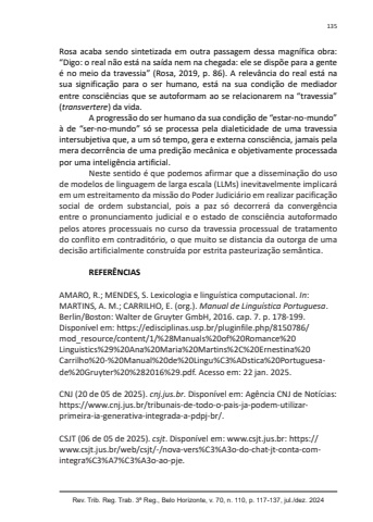 Rev. Trib. Reg. Trab. 3ª Reg., Belo Horizonte, v. 70, n. 110, p. 117-137, jul./dez. 2024135Rosa acaba sendo sintetizada em outra passagem dessa magnífica obra: “Digo: o real não está na saída nem na chegada: ele se dispõe para a gente é no meio da travessia” (Rosa, 2019, p. 86). A relevância do real está na sua significação para o ser humano, está na sua condição de mediador entre consciências que se autoformam ao se relacionarem na “travessia” (transvertere) da vida.A progressão do ser humano da sua condição de “estar-no-mundo” à de “ser-no-mundo” só se processa pela dialeticidade de uma travessia intersubjetiva que, a um só tempo, gera e externa consciência, jamais pela mera decorrência de uma predição mecânica e objetivamente processada por uma inteligência artificial.Neste sentido é que podemos afirmar que a disseminação do uso de modelos de linguagem de larga escala (LLMs) inevitavelmente implicará em um estreitamento da missão do Poder Judiciário em realizar pacificação social de ordem substancial, pois a paz só decorrerá da convergência entre o pronunciamento judicial e o estado de consciência autoformado pelos atores processuais no curso da travessia processual de tratamento do conflito em contraditório, o que muito se distancia da outorga de uma decisão artificialmente construída por estrita pasteurização semântica.REFERÊNCIASAMARO, R.; MENDES, S. Lexicologia e linguística computacional. In: MARTINS, A. M.; CARRILHO, E. (org.). Manual de Linguística Portuguesa. Berlin/Boston: Walter de Gruyter GmbH, 2016. cap. 7. p. 178-199. Disponível em: https://edisciplinas.usp.br/pluginfile.php/8150786/mod_resource/content/1/%28Manuals%20of%20Romance%20Linguistics%29%20Ana%20Maria%20Martins%2C%20Ernestina%20Carrilho%20-%20Manual%20de%20Lingu%C3%ADstica%20Portuguesade%20Gruyter%20%282016%29.pdf. Acesso em: 22 jan. 2025.CNJ (20 de 05 de 2025). cnj.jus.br. Disponível em: Agência CNJ de Notícias: https://www.cnj.jus.br/tribunais-de-todo-o-pais-ja-podem-utilizarprimeira-ia-generativa-integrada-a-pdpj-br/.CSJT (06 de 05 de 2025). csjt. Disponível em: www.csjt.jus.br: https://www.csjt.jus.br/web/csjt/-/nova-vers%C3%A3o-do-chat-jt-conta-comintegra%C3%A7%C3%A3o-ao-pje.