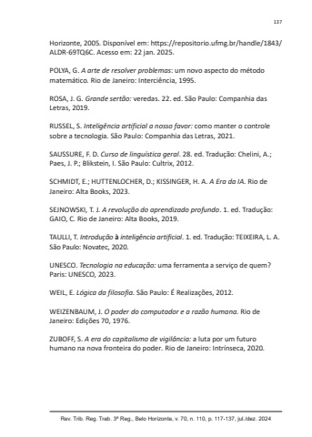 Rev. Trib. Reg. Trab. 3ª Reg., Belo Horizonte, v. 70, n. 110, p. 117-137, jul./dez. 2024137Horizonte, 2005. Disponível em: https://repositorio.ufmg.br/handle/1843/ALDR-69TQ6C. Acesso em: 22 jan. 2025.POLYA, G. A arte de resolver problemas: um novo aspecto do método matemático. Rio de Janeiro: Interciência, 1995.ROSA, J. G. Grande sertão: veredas. 22. ed. São Paulo: Companhia das Letras, 2019.RUSSEL, S. Inteligência artificial a nosso favor: como manter o controle sobre a tecnologia. São Paulo: Companhia das Letras, 2021.SAUSSURE, F. D. Curso de linguística geral. 28. ed. Tradução: Chelini, A.; Paes, J. P.; Blikstein, I. São Paulo: Cultrix, 2012.SCHMIDT, E.; HUTTENLOCHER, D.; KISSINGER, H. A. A Era da IA. Rio de Janeiro: Alta Books, 2023.SEJNOWSKI, T. J. A revolução do aprendizado profundo. 1. ed. Tradução: GAIO, C. Rio de Janeiro: Alta Books, 2019.TAULLI, T. Introdução à inteligência artificial. 1. ed. Tradução: TEIXEIRA, L. A. São Paulo: Novatec, 2020.UNESCO. Tecnologia na educação: uma ferramenta a serviço de quem? Paris: UNESCO, 2023.WEIL, E. Lógica da filosofia. São Paulo: É Realizações, 2012.WEIZENBAUM, J. O poder do computador e a razão humana. Rio de Janeiro: Edições 70, 1976.ZUBOFF, S. A era do capitalismo de vigilância: a luta por um futuro humano na nova fronteira do poder. Rio de Janeiro: Intrínseca, 2020.