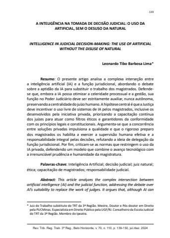 Rev. Trib. Reg. Trab. 3ª Reg., Belo Horizonte, v. 70, n. 110, p. 139-150, jul./dez. 2024139A INTELIGÊNCIA NA TOMADA DE DECISÃO JUDICIAL: O USO DA ARTIFICIAL, SEM O DESUSO DA NATURALINTELLIGENCE IN JUDICIAL DECISION-MAKING: THE USE OF ARTIFICIAL WITHOUT THE DISUSE OF NATURALLeonardo Tibo Barbosa Lima*Resumo: O presente artigo analisa a complexa interseção entre a inteligência artificial (IA) e a função jurisdicional, abordando o debate sobre a aptidão da IA para substituir o trabalho dos magistrados. Defendese que, embora a IA possa otimizar a celeridade processual e a gestão, sua função no Poder Judiciário deve ser estritamente auxiliar, nunca autônoma, preservando a centralidade do juízo humano. A hipótese central é que a Justiça deve incentivar o uso livre de sistemas de IA pelos magistrados, inclusive os desenvolvidos pela iniciativa privada, priorizando a capacitação contínua dos juízes para atuar como filtros éticos e garantidores da conformidade com os princípios legais e constitucionais. Argumenta-se que a concorrência entre soluções privadas impulsiona a qualidade e que o rigoroso preparo dos magistrados os habilita a exercer a supervisão humana efetiva e a responsabilidade integral pelas decisões, refutando a ideia de delegação da função jurisdicional. Por fim, criticam-se as normas que restringem o uso da IA privada, defendendo um modelo que combine o avanço tecnológico com a irrenunciável prudência e humanidade da magistratura.Palavras-chave: Inteligência Artificial; decisão judicial; juiz natural; ética; capacitação de magistrados; responsabilidade judicial.Abstract: This article analyzes the complex intersection between artificial intelligence (AI) and the judicial function, addressing the debate over AI’s suitability to replace the work of judges. It argues that, although AI can * Juiz do Trabalho substituto do TRT da 3ª Região. Mestre, Doutor e Pós-doutor em Direito pela PUCMinas. Especialista em Direito Público pela UGF/RJ. Conselheiro da Escola Judicial do TRT da 3ª Região. Membro do Ipeatra.