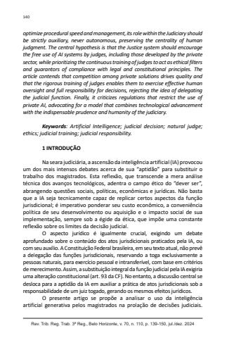Rev. Trib. Reg. Trab. 3ª Reg., Belo Horizonte, v. 70, n. 110, p. 139-150, jul./dez. 2024140optimize procedural speed and management, its role within the Judiciary should be strictly auxiliary, never autonomous, preserving the centrality of human judgment. The central hypothesis is that the Justice system should encourage the free use of AI systems by judges, including those developed by the private sector, while prioritizing the continuous training of judges to act as ethical filters and guarantors of compliance with legal and constitutional principles. The article contends that competition among private solutions drives quality and that the rigorous training of judges enables them to exercise effective human oversight and full responsibility for decisions, rejecting the idea of delegating the judicial function. Finally, it criticizes regulations that restrict the use of private AI, advocating for a model that combines technological advancement with the indispensable prudence and humanity of the judiciary.Keywords: Artificial Intelligence; judicial decision; natural judge; ethics; judicial training; judicial responsibility.1 INTRODUÇÃONa seara judiciária, a ascensão da inteligência artificial (IA) provocou um dos mais intensos debates acerca de sua “aptidão” para substituir o trabalho dos magistrados. Esta reflexão, que transcende a mera análise técnica dos avanços tecnológicos, adentra o campo ético do “dever ser”, abrangendo questões sociais, políticas, econômicas e jurídicas. Não basta que a IA seja tecnicamente capaz de replicar certos aspectos da função jurisdicional; é imperativo ponderar seu custo econômico, a conveniência política de seu desenvolvimento ou aquisição e o impacto social de sua implementação, sempre sob a égide da ética, que impõe uma constante reflexão sobre os limites da decisão judicial.O aspecto jurídico é igualmente crucial, exigindo um debate aprofundado sobre o conteúdo dos atos jurisdicionais praticados pela IA, ou com seu auxílio. A Constituição Federal brasileira, em seu texto atual, não prevê a delegação das funções jurisdicionais, reservando a toga exclusivamente a pessoas naturais, para exercício pessoal e intransferível, com base em critérios de merecimento. Assim, a substituição integral da função judicial pela IA exigiria uma alteração constitucional (art. 93 da CF). No entanto, a discussão central se desloca para a aptidão da IA em auxiliar a prática de atos jurisdicionais sob a responsabilidade de um juiz togado, gerando os mesmos efeitos jurídicos.O presente artigo se propõe a analisar o uso da inteligência artificial generativa pelos magistrados na prolação de decisões judiciais.