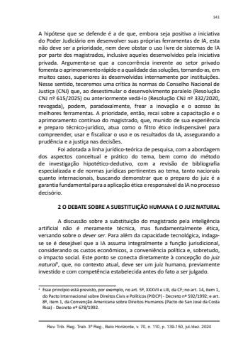 Rev. Trib. Reg. Trab. 3ª Reg., Belo Horizonte, v. 70, n. 110, p. 139-150, jul./dez. 2024141A hipótese que se defende é a de que, embora seja positiva a iniciativa do Poder Judiciário em desenvolver suas próprias ferramentas de IA, esta não deve ser a prioridade, nem deve obstar o uso livre de sistemas de IA por parte dos magistrados, inclusive aqueles desenvolvidos pela iniciativa privada. Argumenta-se que a concorrência inerente ao setor privado fomenta o aprimoramento rápido e a qualidade das soluções, tornando-as, em muitos casos, superiores às desenvolvidas internamente por instituições. Nesse sentido, teceremos uma crítica às normas do Conselho Nacional de Justiça (CNJ) que, ao desestimular o desenvolvimento paralelo (Resolução CNJ nº 615/2025) ou anteriormente vedá-lo (Resolução CNJ nº 332/2020, revogada), podem, paradoxalmente, frear a inovação e o acesso às melhores ferramentas. A prioridade, então, recai sobre a capacitação e o aprimoramento contínuo do magistrado, que, munido de sua experiência e preparo técnico-jurídico, atua como o filtro ético indispensável para compreender, usar e fiscalizar o uso e os resultados da IA, assegurando a prudência e a justiça nas decisões.Foi adotada a linha jurídico-teórica de pesquisa, com a abordagem dos aspectos conceitual e prático do tema, bem como do método de investigação hipotético-dedutivo, com a revisão de bibliografia especializada e de normas jurídicas pertinentes ao tema, tanto nacionais quanto internacionais, buscando demonstrar que o preparo do juiz é a garantia fundamental para a aplicação ética e responsável da IA no processo decisório.2 O DEBATE SOBRE A SUBSTITUIÇÃO HUMANA E O JUIZ NATURALA discussão sobre a substituição do magistrado pela inteligência artificial não é meramente técnica, mas fundamentalmente ética, versando sobre o dever ser. Para além da capacidade tecnológica, indagase se é desejável que a IA assuma integralmente a função jurisdicional, considerando os custos econômicos, a conveniência política e, sobretudo, o impacto social. Este ponto se conecta diretamente à concepção do juiz natural1, que, no contexto atual, deve ser um juiz humano, previamente investido e com competência estabelecida antes do fato a ser julgado.1 Esse princípio está previsto, por exemplo, no art. 5º, XXXVII e LIII, da CF; no art. 14, item 1, do Pacto Internacional sobre Direitos Civis e Políticos (PIDCP) - Decreto nº 592/1992; e art. 8º, item 1, da Convenção Americana sobre Direitos Humanos (Pacto de San José da Costa Rica) - Decreto nº 678/1992.