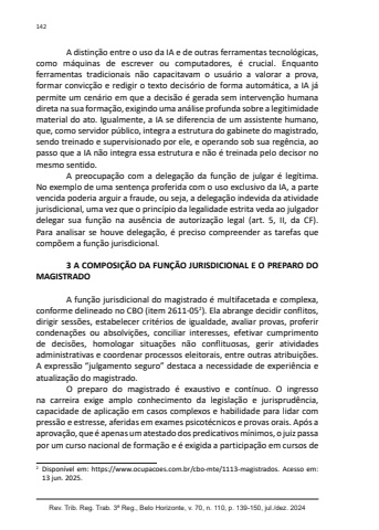 Rev. Trib. Reg. Trab. 3ª Reg., Belo Horizonte, v. 70, n. 110, p. 139-150, jul./dez. 2024142A distinção entre o uso da IA e de outras ferramentas tecnológicas, como máquinas de escrever ou computadores, é crucial. Enquanto ferramentas tradicionais não capacitavam o usuário a valorar a prova, formar convicção e redigir o texto decisório de forma automática, a IA já permite um cenário em que a decisão é gerada sem intervenção humana direta na sua formação, exigindo uma análise profunda sobre a legitimidade material do ato. Igualmente, a IA se diferencia de um assistente humano, que, como servidor público, integra a estrutura do gabinete do magistrado, sendo treinado e supervisionado por ele, e operando sob sua regência, ao passo que a IA não integra essa estrutura e não é treinada pelo decisor no mesmo sentido.A preocupação com a delegação da função de julgar é legítima. No exemplo de uma sentença proferida com o uso exclusivo da IA, a parte vencida poderia arguir a fraude, ou seja, a delegação indevida da atividade jurisdicional, uma vez que o princípio da legalidade estrita veda ao julgador delegar sua função na ausência de autorização legal (art. 5, II, da CF). Para analisar se houve delegação, é preciso compreender as tarefas que compõem a função jurisdicional.3 A COMPOSIÇÃO DA FUNÇÃO JURISDICIONAL E O PREPARO DO MAGISTRADOA função jurisdicional do magistrado é multifacetada e complexa, conforme delineado no CBO (item 2611-052). Ela abrange decidir conflitos, dirigir sessões, estabelecer critérios de igualdade, avaliar provas, proferir condenações ou absolvições, conciliar interesses, efetivar cumprimento de decisões, homologar situações não conflituosas, gerir atividades administrativas e coordenar processos eleitorais, entre outras atribuições. A expressão “julgamento seguro” destaca a necessidade de experiência e atualização do magistrado.O preparo do magistrado é exaustivo e contínuo. O ingresso na carreira exige amplo conhecimento da legislação e jurisprudência, capacidade de aplicação em casos complexos e habilidade para lidar com pressão e estresse, aferidas em exames psicotécnicos e provas orais. Após a aprovação, que é apenas um atestado dos predicativos mínimos, o juiz passa por um curso nacional de formação e é exigida a participação em cursos de 2 Disponível em: https://www.ocupacoes.com.br/cbo-mte/1113-magistrados. Acesso em: 13 jun. 2025.