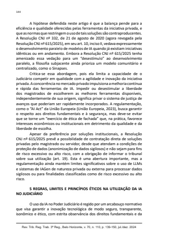 Rev. Trib. Reg. Trab. 3ª Reg., Belo Horizonte, v. 70, n. 110, p. 139-150, jul./dez. 2024144A hipótese defendida neste artigo é que a balança pende para a eficiência e qualidade oferecidas pelas ferramentas da iniciativa privada, e que as normas que restringem o uso de tais soluções são contraproducentes. A Resolução CNJ nº 332, de 21 de agosto de 2020 (agora revogada pela Resolução CNJ nº 615/2025), em seu art. 10, inciso II, vedava expressamente o desenvolvimento paralelo de modelos de IA quando já existiam iniciativas idênticas ou em andamento. Embora a Resolução CNJ nº 615/2025 tenha amenizado essa vedação para um “desestímulo” ao desenvolvimento paralelo, a filosofia subjacente ainda prioriza um modelo comunitário e centralizado, como o Sinapses.Critica-se essa abordagem, pois ela limita a capacidade de o Judiciário competir em qualidade com a agilidade e inovação da iniciativa privada. A concorrência no mercado privado impulsiona a melhoria contínua e rápida das ferramentas de IA. Impedir ou desestimular a liberdade dos magistrados de escolherem as melhores ferramentas disponíveis, independentemente de sua origem, significa privar o sistema de justiça de avanços que poderiam ser rapidamente incorporados. A regulamentação, como o “AI Act” da União Europeia (União Europeia, 2023), busca garantir o respeito aos direitos fundamentais e à segurança, mas deve-se evitar que se torne um “exercício de ética de fachada” que, na prática, favorece interesses econômicos ou institucionais em detrimento da qualidade e da liberdade de escolha.Apesar da preferência por soluções institucionais, a Resolução CNJ nº 615/2025 prevê a possibilidade de contratação direta de soluções privadas pelo magistrado ou servidor, desde que atendam a condições de proteção de dados (anonimização de dados sigilosos) e não sejam para fins de risco excessivo ou alto risco, com a obrigação de informar o tribunal sobre sua utilização (art. 19). Esta é uma abertura importante, mas a regulamentação ainda mantém limites significativos sobre o uso de LLMs e sistemas de IAGen de natureza privada ou externa para processar dados sigilosos ou para finalidades classificadas como de risco excessivo ou alto risco.5 REGRAS, LIMITES E PRINCÍPIOS ÉTICOS NA UTILIZAÇÃO DA IA NO JUDICIÁRIOO uso da IA no Poder Judiciário é regido por um arcabouço normativo que visa garantir a inovação tecnológica de modo seguro, transparente, isonômico e ético, com estrita observância dos direitos fundamentais e da