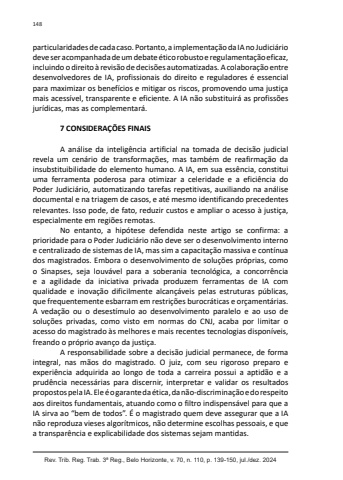 Rev. Trib. Reg. Trab. 3ª Reg., Belo Horizonte, v. 70, n. 110, p. 139-150, jul./dez. 2024148particularidades de cada caso. Portanto, a implementação da IA no Judiciário deve ser acompanhada de um debate ético robusto e regulamentação eficaz, incluindo o direito à revisão de decisões automatizadas. A colaboração entre desenvolvedores de IA, profissionais do direito e reguladores é essencial para maximizar os benefícios e mitigar os riscos, promovendo uma justiça mais acessível, transparente e eficiente. A IA não substituirá as profissões jurídicas, mas as complementará.7 CONSIDERAÇÕES FINAISA análise da inteligência artificial na tomada de decisão judicial revela um cenário de transformações, mas também de reafirmação da insubstituibilidade do elemento humano. A IA, em sua essência, constitui uma ferramenta poderosa para otimizar a celeridade e a eficiência do Poder Judiciário, automatizando tarefas repetitivas, auxiliando na análise documental e na triagem de casos, e até mesmo identificando precedentes relevantes. Isso pode, de fato, reduzir custos e ampliar o acesso à justiça, especialmente em regiões remotas.No entanto, a hipótese defendida neste artigo se confirma: a prioridade para o Poder Judiciário não deve ser o desenvolvimento interno e centralizado de sistemas de IA, mas sim a capacitação massiva e contínua dos magistrados. Embora o desenvolvimento de soluções próprias, como o Sinapses, seja louvável para a soberania tecnológica, a concorrência e a agilidade da iniciativa privada produzem ferramentas de IA com qualidade e inovação dificilmente alcançáveis pelas estruturas públicas, que frequentemente esbarram em restrições burocráticas e orçamentárias. A vedação ou o desestímulo ao desenvolvimento paralelo e ao uso de soluções privadas, como visto em normas do CNJ, acaba por limitar o acesso do magistrado às melhores e mais recentes tecnologias disponíveis, freando o próprio avanço da justiça.A responsabilidade sobre a decisão judicial permanece, de forma integral, nas mãos do magistrado. O juiz, com seu rigoroso preparo e experiência adquirida ao longo de toda a carreira possui a aptidão e a prudência necessárias para discernir, interpretar e validar os resultados propostos pela IA. Ele é o garante da ética, da não-discriminação e do respeito aos direitos fundamentais, atuando como o filtro indispensável para que a IA sirva ao “bem de todos”. É o magistrado quem deve assegurar que a IA não reproduza vieses algorítmicos, não determine escolhas pessoais, e que a transparência e explicabilidade dos sistemas sejam mantidas.