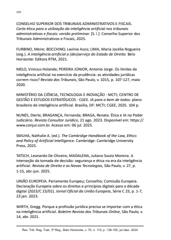 Rev. Trib. Reg. Trab. 3ª Reg., Belo Horizonte, v. 70, n. 110, p. 139-150, jul./dez. 2024150CONSELHO SUPERIOR DOS TRIBUNAIS ADMINISTRATIVOS E FISCAIS. Carta ética para a utilização da inteligência artificial nos tribunais administrativos e fiscais: versão preliminar. [S. l.]: Conselho Superior dos Tribunais Administrativos e Fiscais, 2025.FURBINO, Meire; BOCCHINO, Lavínia Assis; LIMA, Maria Jocélia Nogueira (org.). A inteligência artificial a (des)serviço do Estado de Direito. Belo Horizonte: Editora RTM, 2021.MELO, Vinicius Holanda; PEREIRA JÚNIOR, Antonio Jorge. Os limites da inteligência artificial no exercício da prudência: as atividades jurídicas correm risco? Revista dos Tribunais, São Paulo, v. 1015, p. 107-127, maio 2020.MINISTÉRIO DA CIÊNCIA, TECNOLOGIA E INOVAÇÃO - MCTI; CENTRO DE GESTÃO E ESTUDOS ESTRATÉGICOS - CGEE. IA para o bem de todos: plano brasileiro de inteligência artificial. Brasília, DF: MCTI; CGEE, 2025. 104 p.NUNES, Dierle; BRAGANÇA, Fernanda; BRAGA, Renata. Ética e IA no Poder Judiciário. Revista Consultor Jurídico, 21 ago. 2023. Disponível em: https://www.conjur.com.br. Acesso em: 06 jul. 2025.SMUHA, Nathalie A. (ed.). The Cambridge Handbook of the Law, Ethics and Policy of Artificial Intelligence. Cambridge: Cambridge University Press, 2025.TATSCH, Leonardo De Oliveira; MADALENA, Juliano Souto Moreira. A interseção da tomada de decisão: segurança e ética na era da inteligência artificial. Revista de Direito e as Novas Tecnologias, São Paulo, v. 27, p. 1-15, abr.-jun. 2025.UNIÃO EUROPEIA. Parlamento Europeu; Conselho; Comissão Europeia. Declaração Europeia sobre os direitos e princípios digitais para a década digital (2023/C 23/01). Jornal Oficial da União Europeia, Série C 23, p. 1-7, 23 jan. 2023.WIRTH, Gregg. Porque a profissão jurídica precisa se importar com a ética na inteligência artificial. Boletim Revista dos Tribunais Online, São Paulo, v. 14, abr. 2021.