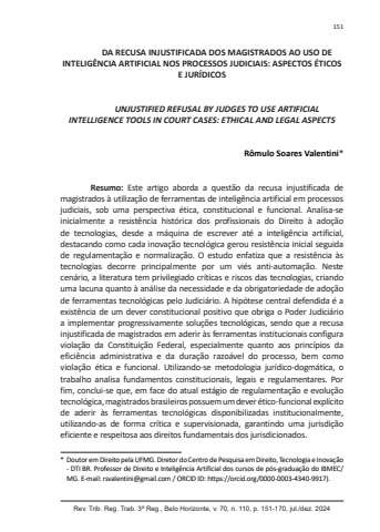 Rev. Trib. Reg. Trab. 3ª Reg., Belo Horizonte, v. 70, n. 110, p. 151-170, jul./dez. 2024151DA RECUSA INJUSTIFICADA DOS MAGISTRADOS AO USO DE INTELIGÊNCIA ARTIFICIAL NOS PROCESSOS JUDICIAIS: ASPECTOS ÉTICOS E JURÍDICOSUNJUSTIFIED REFUSAL BY JUDGES TO USE ARTIFICIAL INTELLIGENCE TOOLS IN COURT CASES: ETHICAL AND LEGAL ASPECTSRômulo Soares Valentini*Resumo: Este artigo aborda a questão da recusa injustificada de magistrados à utilização de ferramentas de inteligência artificial em processos judiciais, sob uma perspectiva ética, constitucional e funcional. Analisa-se inicialmente a resistência histórica dos profissionais do Direito à adoção de tecnologias, desde a máquina de escrever até a inteligência artificial, destacando como cada inovação tecnológica gerou resistência inicial seguida de regulamentação e normalização. O estudo enfatiza que a resistência às tecnologias decorre principalmente por um viés anti-automação. Neste cenário, a literatura tem privilegiado críticas e riscos das tecnologias, criando uma lacuna quanto à análise da necessidade e da obrigatoriedade de adoção de ferramentas tecnológicas pelo Judiciário. A hipótese central defendida é a existência de um dever constitucional positivo que obriga o Poder Judiciário a implementar progressivamente soluções tecnológicas, sendo que a recusa injustificada de magistrados em aderir às ferramentas institucionais configura violação da Constituição Federal, especialmente quanto aos princípios da eficiência administrativa e da duração razoável do processo, bem como violação ética e funcional. Utilizando-se metodologia jurídico-dogmática, o trabalho analisa fundamentos constitucionais, legais e regulamentares. Por fim, conclui-se que, em face do atual estágio de regulamentação e evolução tecnológica, magistrados brasileiros possuem um dever ético-funcional explícito de aderir às ferramentas tecnológicas disponibilizadas institucionalmente, utilizando-as de forma crítica e supervisionada, garantindo uma jurisdição eficiente e respeitosa aos direitos fundamentais dos jurisdicionados.* Doutor em Direito pela UFMG. Diretor do Centro de Pesquisa em Direito, Tecnologia e Inovação - DTI BR. Professor de Direito e Inteligência Artificial dos cursos de pós-graduação do IBMEC/MG. E-mail: rsvalentini@gmail.com / ORCID ID: https://orcid.org/0000-0003-4340-9917).