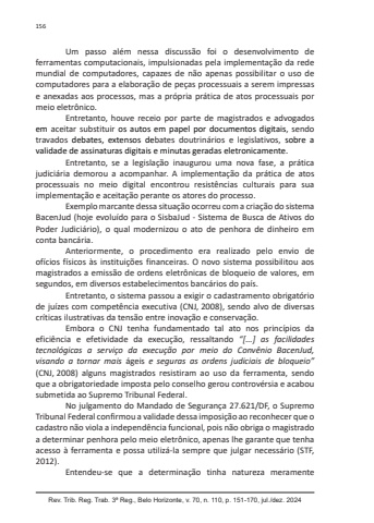 Rev. Trib. Reg. Trab. 3ª Reg., Belo Horizonte, v. 70, n. 110, p. 151-170, jul./dez. 2024156Um passo além nessa discussão foi o desenvolvimento de ferramentas computacionais, impulsionadas pela implementação da rede mundial de computadores, capazes de não apenas possibilitar o uso de computadores para a elaboração de peças processuais a serem impressas e anexadas aos processos, mas a própria prática de atos processuais por meio eletrônico.Entretanto, houve receio por parte de magistrados e advogadosem aceitar substituir os autos em papel por documentos digitais, sendo travados debates, extensos debates doutrinários e legislativos, sobre a validade de assinaturas digitais e minutas geradas eletronicamente.Entretanto, se a legislação inaugurou uma nova fase, a prática judiciária demorou a acompanhar. A implementação da prática de atos processuais no meio digital encontrou resistências culturais para sua implementação e aceitação perante os atores do processo.Exemplo marcante dessa situação ocorreu com a criação do sistema BacenJud (hoje evoluído para o SisbaJud - Sistema de Busca de Ativos do Poder Judiciário), o qual modernizou o ato de penhora de dinheiro em conta bancária.Anteriormente, o procedimento era realizado pelo envio de ofícios físicos às instituições financeiras. O novo sistema possibilitou aos magistrados a emissão de ordens eletrônicas de bloqueio de valores, em segundos, em diversos estabelecimentos bancários do país.Entretanto, o sistema passou a exigir o cadastramento obrigatório de juízes com competência executiva (CNJ, 2008), sendo alvo de diversas críticas ilustrativas da tensão entre inovação e conservação.Embora o CNJ tenha fundamentado tal ato nos princípios da eficiência e efetividade da execução, ressaltando “[...] as facilidades tecnológicas a serviço da execução por meio do Convênio BacenJud, visando a tornar mais ágeis e seguras as ordens judiciais de bloqueio” (CNJ, 2008) alguns magistrados resistiram ao uso da ferramenta, sendo que a obrigatoriedade imposta pelo conselho gerou controvérsia e acabou submetida ao Supremo Tribunal Federal.No julgamento do Mandado de Segurança 27.621/DF, o Supremo Tribunal Federal confirmou a validade dessa imposição ao reconhecer que o cadastro não viola a independência funcional, pois não obriga o magistrado a determinar penhora pelo meio eletrônico, apenas lhe garante que tenha acesso à ferramenta e possa utilizá-la sempre que julgar necessário (STF, 2012).Entendeu-se que a determinação tinha natureza meramente