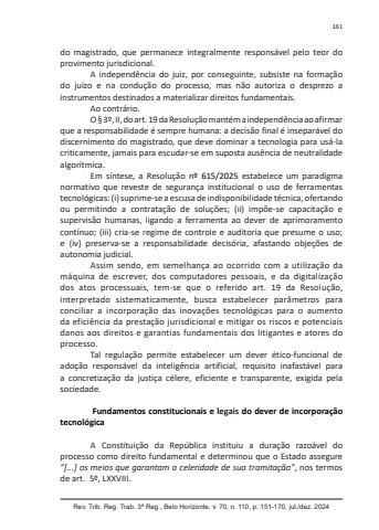 Rev. Trib. Reg. Trab. 3ª Reg., Belo Horizonte, v. 70, n. 110, p. 151-170, jul./dez. 2024161do magistrado, que permanece integralmente responsável pelo teor do provimento jurisdicional.A independência do juiz, por conseguinte, subsiste na formação do juízo e na condução do processo, mas não autoriza o desprezo a instrumentos destinados a materializar direitos fundamentais.Ao contrário.O § 3º, II, do art. 19 da Resolução mantém a independência ao afirmar que a responsabilidade é sempre humana: a decisão final é inseparável do discernimento do magistrado, que deve dominar a tecnologia para usá-la criticamente, jamais para escudar-se em suposta ausência de neutralidade algorítmica.Em síntese, a Resolução nº 615/2025 estabelece um paradigma normativo que reveste de segurança institucional o uso de ferramentas tecnológicas: (i) suprime-se a escusa de indisponibilidade técnica, ofertando ou permitindo a contratação de soluções; (ii) impõe-se capacitação e supervisão humanas, ligando a ferramenta ao dever de aprimoramento contínuo; (iii) cria-se regime de controle e auditoria que presume o uso; e (iv) preserva-se a responsabilidade decisória, afastando objeções de autonomia judicial.Assim sendo, em semelhança ao ocorrido com a utilização da máquina de escrever, dos computadores pessoais, e da digitalização dos atos processuais, tem-se que o referido art. 19 da Resolução, interpretado sistematicamente, busca estabelecer parâmetros para conciliar a incorporação das inovações tecnológicas para o aumento da eficiência da prestação jurisdicional e mitigar os riscos e potenciais danos aos direitos e garantias fundamentais dos litigantes e atores do processo.Tal regulação permite estabelecer um dever ético-funcional de adoção responsável da inteligência artificial, requisito inafastável para a concretização da justiça célere, eficiente e transparente, exigida pela sociedade.Fundamentos constitucionais e legais do dever de incorporação tecnológicaA Constituição da República instituiu a duração razoável do processo como direito fundamental e determinou que o Estado assegure “[...] os meios que garantam a celeridade de sua tramitação”, nos termos de art. 5º, LXXVIII.