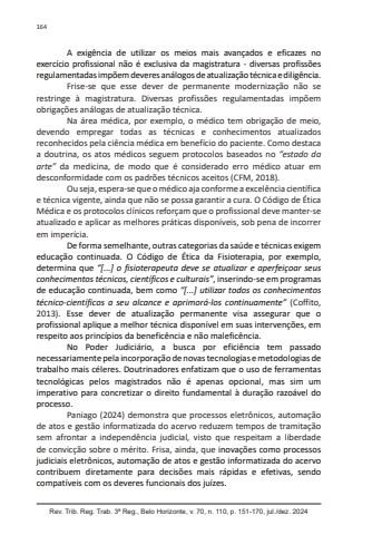 Rev. Trib. Reg. Trab. 3ª Reg., Belo Horizonte, v. 70, n. 110, p. 151-170, jul./dez. 2024164A exigência de utilizar os meios mais avançados e eficazes no exercício profissional não é exclusiva da magistratura - diversas profissões regulamentadas impõem deveres análogos de atualização técnica e diligência.Frise-se que esse dever de permanente modernização não se restringe à magistratura. Diversas profissões regulamentadas impõem obrigações análogas de atualização técnica.Na área médica, por exemplo, o médico tem obrigação de meio, devendo empregar todas as técnicas e conhecimentos atualizados reconhecidos pela ciência médica em benefício do paciente. Como destaca a doutrina, os atos médicos seguem protocolos baseados no “estado da arte” da medicina, de modo que é considerado erro médico atuar em desconformidade com os padrões técnicos aceitos (CFM, 2018).Ou seja, espera-se que o médico aja conforme a excelência científica e técnica vigente, ainda que não se possa garantir a cura. O Código de Ética Médica e os protocolos clínicos reforçam que o profissional deve manter-se atualizado e aplicar as melhores práticas disponíveis, sob pena de incorrer em imperícia.De forma semelhante, outras categorias da saúde e técnicas exigem educação continuada. O Código de Ética da Fisioterapia, por exemplo, determina que “[...] o fisioterapeuta deve se atualizar e aperfeiçoar seus conhecimentos técnicos, científicos e culturais”, inserindo-se em programas de educação continuada, bem como “[...] utilizar todos os conhecimentos técnico-científicos a seu alcance e aprimorá-los continuamente” (Coffito, 2013). Esse dever de atualização permanente visa assegurar que o profissional aplique a melhor técnica disponível em suas intervenções, em respeito aos princípios da beneficência e não maleficência.No Poder Judiciário, a busca por eficiência tem passado necessariamente pela incorporação de novas tecnologias e metodologias de trabalho mais céleres. Doutrinadores enfatizam que o uso de ferramentas tecnológicas pelos magistrados não é apenas opcional, mas sim um imperativo para concretizar o direito fundamental à duração razoável do processo.Paniago (2024) demonstra que processos eletrônicos, automação de atos e gestão informatizada do acervo reduzem tempos de tramitação sem afrontar a independência judicial, visto que respeitam a liberdade de convicção sobre o mérito. Frisa, ainda, que inovações como processos judiciais eletrônicos, automação de atos e gestão informatizada do acervo contribuem diretamente para decisões mais rápidas e efetivas, sendo compatíveis com os deveres funcionais dos juízes.