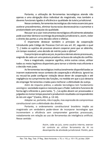 Rev. Trib. Reg. Trab. 3ª Reg., Belo Horizonte, v. 70, n. 110, p. 151-170, jul./dez. 2024165Portanto, a utilização de ferramentas tecnológicas atende não apenas a uma obrigação ética individual do magistrado, mas também a deveres funcionais ligados à eficiência e qualidade da tutela jurisdicional.Nesse contexto, ferramentas tecnológicas são meios essenciais para acelerar procedimentos, eliminar burocracias desnecessárias e aumentar a produtividade sem prejuízo da qualidade.Recusar-se a usar instrumentos tecnológicos oficialmente adotados pode acarretar demora na entrega da prestação jurisdicional e, assim, violar o direito das partes a uma decisão célere e efetiva.É importante destacar também o princípio da cooperação introduzido pelo Código de Processo Civil em seu art. 6º, segundo o qual “[...] todos os sujeitos do processo devem cooperar para que se obtenha, em tempo razoável, uma decisão de mérito justa e efetiva”.Esse princípio se aplica ao juiz, às partes e demais atores processuais, exigindo de cada um uma postura proativa na busca da solução do conflito.Para o magistrado, cooperar significa, entre outras coisas, utilizar todos os meios legítimos disponíveis para tornar o trâmite mais eficiente e a decisão mais justa.As ferramentas tecnológicas institucionalmente disponibilizadas se inserem exatamente nesse contexto de cooperação e eficiência. Ignorá-las ou recusá-las pode configurar violação desse dever de cooperação e até negligência no cumprimento das funções, na medida em que o juiz deixaria de empregar ferramentas criadas para melhorar a efetividade da Justiça.Além do impacto prático, a adesão tecnológica tem fundamento axiológico: sociedade espera e necessita que o Poder Judiciário funcione de forma ágil e eficiente e, para tanto, “[...] as ações devem ser processadas e julgadas no menor tempo possível e produzirem resultados correspondentes às leis em vigor” (Castro, 2014, p. 13-14).Adaptar-se, portanto, não é opção, mas expressão do compromisso constitucional com a efetividade dos direitos.Portanto, o ordenamento constitucional brasileiro impõe ao magistrado um verdadeiro poder-dever de incorporar tecnologias que incrementem a eficiência sem comprometer garantias processuais, notadamente em relação ao uso de ferramentas de inteligência artificial. Nesse sentido:Assim, cabe ao juiz, como usuário interno, exercer tal controle ao utilizar ferramenta de IA no desempenho da atividade jurisdicional. Porém, para