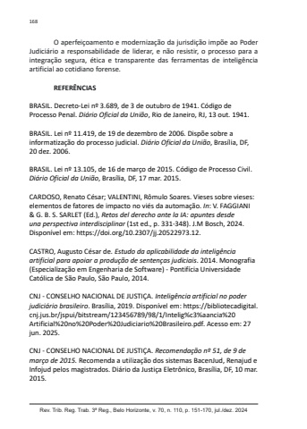 Rev. Trib. Reg. Trab. 3ª Reg., Belo Horizonte, v. 70, n. 110, p. 151-170, jul./dez. 2024168O aperfeiçoamento e modernização da jurisdição impõe ao Poder Judiciário a responsabilidade de liderar, e não resistir, o processo para a integração segura, ética e transparente das ferramentas de inteligência artificial ao cotidiano forense.REFERÊNCIASBRASIL. Decreto-Lei nº 3.689, de 3 de outubro de 1941. Código de Processo Penal. Diário Oficial da União, Rio de Janeiro, RJ, 13 out. 1941.BRASIL. Lei nº 11.419, de 19 de dezembro de 2006. Dispõe sobre a informatização do processo judicial. Diário Oficial da União, Brasília, DF, 20 dez. 2006.BRASIL. Lei nº 13.105, de 16 de março de 2015. Código de Processo Civil. Diário Oficial da União, Brasília, DF, 17 mar. 2015.CARDOSO, Renato César; VALENTINI, Rômulo Soares. Vieses sobre vieses: elementos de fatores de impacto no viés da automação. In: V. FAGGIANI & G. B. S. SARLET (Ed.), Retos del derecho ante la IA: apuntes desde una perspectiva interdisciplinar (1st ed., p. 331-348). J.M Bosch, 2024.Disponível em: https://doi.org/10.2307/jj.20522973.12.CASTRO, Augusto César de. Estudo da aplicabilidade da inteligência artificial para apoiar a produção de sentenças judiciais. 2014. Monografia (Especialização em Engenharia de Software) - Pontifícia Universidade Católica de São Paulo, São Paulo, 2014.CNJ - CONSELHO NACIONAL DE JUSTIÇA. Inteligência artificial no poder judiciário brasileiro. Brasília, 2019. Disponível em: https://bibliotecadigital.cnj.jus.br/jspui/bitstream/123456789/98/1/Intelig%c3%aancia%20Artificial%20no%20Poder%20Judiciario%20Brasileiro.pdf. Acesso em: 27 jun. 2025.CNJ - CONSELHO NACIONAL DE JUSTIÇA. Recomendação nº 51, de 9 de março de 2015. Recomenda a utilização dos sistemas BacenJud, Renajud e Infojud pelos magistrados. Diário da Justiça Eletrônico, Brasília, DF, 10 mar. 2015.