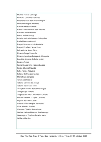 Rev. Trib. Reg. Trab. 3ª Reg., Belo Horizonte, v. 70, n. 110, p. 07-17, jul./dez. 2024Murillo Franco CamargoNathália Carvalho MenezesNelsilene Leão de Carvalho DupinOsmar Rodrigues BrandãoPaola Barbosa de MeloPatrícia Vieira Nunes de CarvalhoPaula de Almeida PiresPedro Mallet KneippPriscila Andrade Cravero GuimarãesRachel Ferreira CazottiRaquel Drummond de AndradeRaquel Elizabeth Senra LimaReinaldo de Souza PintoRicardo Gurgel NoronhaRicardo Henrique Botega de MesquitaRonaldo Antônio de Brito JúniorRosério FirmoSamantha da Silva Hassen BorgesSérgio Silveira MourãoSofia Fontes RegueiraSolainy Beltrão dos SantosStella Fiúza CançadoTarsila Vaz RibeiroTatiana Carolina de AraújoTatiane David Luiz FariaThallyta Ranyelle de Fátima BorgesThiago Saço FerreiraTiago José Gama Carvalho de OliveiraUilliam Frederic D’Lopes CarvalhoUlysses de Abreu CésarValéria Valim Mengue de MatosVitor Martins PomboVivianne Oliveira de AndradeWalace Heleno Miranda de AlvarengaWashington Timóteo Teixeira NetoWilliam Martins