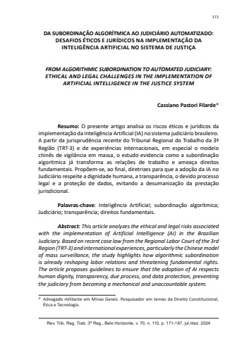 Rev. Trib. Reg. Trab. 3ª Reg., Belo Horizonte, v. 70, n. 110, p. 171-187, jul./dez. 2024171DA SUBORDINAÇÃO ALGORÍTMICA AO JUDICIÁRIO AUTOMATIZADO:DESAFIOS ÉTICOS E JURÍDICOS NA IMPLEMENTAÇÃO DA INTELIGÊNCIA ARTIFICIAL NO SISTEMA DE JUSTIÇAFROM ALGORITHMIC SUBORDINATION TO AUTOMATED JUDICIARY:ETHICAL AND LEGAL CHALLENGES IN THE IMPLEMENTATION OF ARTIFICIAL INTELLIGENCE IN THE JUSTICE SYSTEMCassiano Pastori Filarde*Resumo: O presente artigo analisa os riscos éticos e jurídicos da implementação da Inteligência Artificial (IA) no sistema judiciário brasileiro. A partir da jurisprudência recente do Tribunal Regional do Trabalho da 3ª Região (TRT-3) e de experiências internacionais, em especial o modelo chinês de vigilância em massa, o estudo evidencia como a subordinação algorítmica já transforma as relações de trabalho e ameaça direitos fundamentais. Propõem-se, ao final, diretrizes para que a adoção da IA no Judiciário respeite a dignidade humana, a transparência, o devido processo legal e a proteção de dados, evitando a desumanização da prestação jurisdicional.Palavras-chave: Inteligência Artificial; subordinação algorítmica; Judiciário; transparência; direitos fundamentais.Abstract: This article analyzes the ethical and legal risks associated with the implementation of Artificial Intelligence (AI) in the Brazilian Judiciary. Based on recent case law from the Regional Labor Court of the 3rd Region (TRT-3) and inte rnational experiences, particularly the Chinese model of mass surveillance, the study highlights how algorithmic subordination is already reshaping labor relations and threatening fundamental rights. The article proposes guidelines to ensure that the adoption of AI respects human dignity, transparency, due process, and data protection, preventing the judiciary from becoming a mechanical and unaccountable system.* Advogado militante em Minas Gerais. Pesquisador em temas de Direito Constitucional, Ética e Tecnologia.