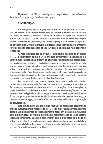 Rev. Trib. Reg. Trab. 3ª Reg., Belo Horizonte, v. 70, n. 110, p. 171-187, jul./dez. 2024172Keywords: Artificial Intelligence; algorithmic subordination; Judiciary; transparency; fundamental rights.1 INTRODUÇÃOA inteligência artificial (IA) deixou de ser uma promessa futurista para se tornar uma realidade concreta em diversas esferas da sociedade, incluindo o sistema judiciário. Desde ferramentas simples de consulta e elaboração de peças, como o ChatGPT, até sofisticados sistemas de triagem processual e análise preditiva, a IA tem sido progressivamente incorporada ao cotidiano do Direito. Contudo, a adoção dessa tecnologia no ambiente jurídico suscita preocupações éticas, jurídicas e sociais que não podem ser ignoradas.As recentes decisões do Tribunal Regional do Trabalho da 3ª Região (TRT-3) demonstram como a IA já impacta diretamente a sociedade e o Direito. Nos julgados que tratam da chamada “subordinação algorítmica” em plataformas digitais, o Judiciário reconhece que os algoritmos não apenas gerenciam atividades econômicas, mas também exercem controle sobre trabalhadores, moldando relações jurídicas de maneira invisível e automatizada. Esse fenômeno revela que a IA, quando desprovida de transparência e de controle humano adequado, pode gerar efeitos jurídicos relevantes, inclusive lesivos aos direitos fundamentais.Por outro lado, ao mesmo tempo em que o Judiciário analisa os impactos da IA nas relações sociais, ele próprio começa a se valer de ferramentas algorítmicas para otimizar sua atuação. Essa transição do papel tradicional do juiz para o apoio ou mesmo a substituição parcial por sistemas de inteligência artificial exige um exame criterioso, especialmente à luz dos princípios constitucionais da dignidade da pessoa humana, do devido processo legal, da motivação das decisões judiciais e da proteção da privacidade.Este artigo parte da análise de resoluções, trabalhos acadêmicos, artigos, jurisprudência recente do TRT-3 e de experiências internacionais, como o uso de sistemas de reconhecimento facial em larga escala na China, para problematizar os riscos e desafios da implementação da IA no sistema judiciário brasileiro. Busca-se demonstrar que a eficiência não pode se sobrepor aos direitos fundamentais e que a transparência, a explicabilidade e a responsabilidade humana continuam sendo exigências irrenunciáveis em um Estado Democrático de Direito.