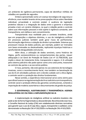 Rev. Trib. Reg. Trab. 3ª Reg., Belo Horizonte, v. 70, n. 110, p. 171-187, jul./dez. 2024176um ambiente de vigilância permanente, capaz de identificar milhões de cidadãos em questão de segundos.Embora apresentado como um avanço tecnológico de segurança e eficiência, esse modelo levanta sérias preocupações éticas sobre liberdade individual, privacidade e controle estatal. A ausência de legislação protetiva robusta e a integração de dados entre o governo e empresas privadas criam um cenário distópico, no qual o cidadão perde o controle sobre suas informações pessoais e está sujeito à vigilância constante, sem transparência, sem defesa e sem consentimento.Transportando essa realidade para o contexto brasileiro, ainda que em proporções e objetivos distintos, o uso de inteligência artificial em processos judiciais também pode gerar riscos de perfilamento, discriminação algorítmica e violação do direito à privacidade. Sistemas que processam massas de dados judiciais, por exemplo, podem ser treinados com bases enviesadas ou desatualizadas, replicando injustiças históricas e aprofundando desigualdades estruturais.Além disso, a utilização de dados sensíveis, como histórico de litígios, perfis socioeconômicos ou comportamentais das partes, requer adequação à Lei Geral de Proteção de Dados (Lei nº 13.709/2018), que impõe o dever de tratamento lícito, transparente e seguro. A IA utilizada pelo sistema judiciário não pode operar como uma caixa-preta, inacessível ao controle das partes e ao escrutínio público.O risco, portanto, não está apenas no uso ostensivo de tecnologias invasivas, como o reconhecimento facial, mas também na banalização do uso da IA em atividades judiciais sem o devido cuidado com a ética digital, o controle social e a proteção dos direitos fundamentais.Nesse sentido, a experiência internacional serve como alerta para que o Brasil avance na regulamentação da IA no Judiciário com transparência, controle social e proteção efetiva das garantias constitucionais, evitando a importação de modelos autoritários e desumanizantes de gestão da justiça.5 GOVERNANÇA, AUDITABILIDADE E TRANSPARÊNCIA: AGENDA REGULATÓRIA DO CNJ PARA A IMPLEMENTAÇÃO DA IAA implementação da inteligência artificial no Judiciário brasileiro não pode se dar de forma fragmentada ou descoordenada. Reconhecendo esse risco, o Conselho Nacional de Justiça (CNJ) vem estabelecendo diretrizes normativas para garantir que o uso da IA seja ético, seguro, transparente e auditável, como demonstrado na Resolução CNJ nº 332/2020 e na Resolução CNJ nº 615/2025.
