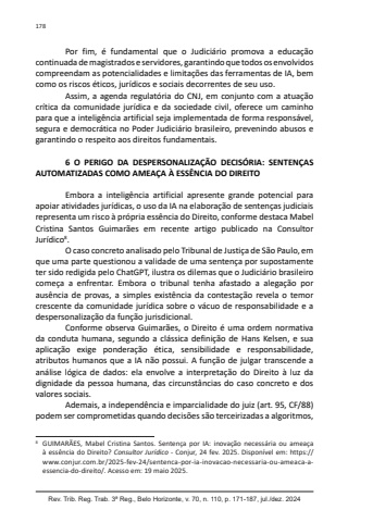 Rev. Trib. Reg. Trab. 3ª Reg., Belo Horizonte, v. 70, n. 110, p. 171-187, jul./dez. 2024178Por fim, é fundamental que o Judiciário promova a educação continuada de magistrados e servidores, garantindo que todos os envolvidos compreendam as potencialidades e limitações das ferramentas de IA, bem como os riscos éticos, jurídicos e sociais decorrentes de seu uso.Assim, a agenda regulatória do CNJ, em conjunto com a atuação crítica da comunidade jurídica e da sociedade civil, oferece um caminho para que a inteligência artificial seja implementada de forma responsável, segura e democrática no Poder Judiciário brasileiro, prevenindo abusos e garantindo o respeito aos direitos fundamentais.6 O PERIGO DA DESPERSONALIZAÇÃO DECISÓRIA: SENTENÇAS AUTOMATIZADAS COMO AMEAÇA À ESSÊNCIA DO DIREITOEmbora a inteligência artificial apresente grande potencial para apoiar atividades jurídicas, o uso da IA na elaboração de sentenças judiciais representa um risco à própria essência do Direito, conforme destaca Mabel Cristina Santos Guimarães em recente artigo publicado na Consultor Jurídico8.O caso concreto analisado pelo Tribunal de Justiça de São Paulo, em que uma parte questionou a validade de uma sentença por supostamente ter sido redigida pelo ChatGPT, ilustra os dilemas que o Judiciário brasileiro começa a enfrentar. Embora o tribunal tenha afastado a alegação por ausência de provas, a simples existência da contestação revela o temor crescente da comunidade jurídica sobre o vácuo de responsabilidade e a despersonalização da função jurisdicional.Conforme observa Guimarães, o Direito é uma ordem normativa da conduta humana, segundo a clássica definição de Hans Kelsen, e sua aplicação exige ponderação ética, sensibilidade e responsabilidade, atributos humanos que a IA não possui. A função de julgar transcende a análise lógica de dados: ela envolve a interpretação do Direito à luz da dignidade da pessoa humana, das circunstâncias do caso concreto e dos valores sociais.Ademais, a independência e imparcialidade do juiz (art. 95, CF/88) podem ser comprometidas quando decisões são terceirizadas a algoritmos, 8 GUIMARÃES, Mabel Cristina Santos. Sentença por IA: inovação necessária ou ameaça à essência do Direito? Consultor Jurídico - Conjur, 24 fev. 2025. Disponível em: https://www.conjur.com.br/2025-fev-24/sentenca-por-ia-inovacao-necessaria-ou-ameaca-aessencia-do-direito/. Acesso em: 19 maio 2025.