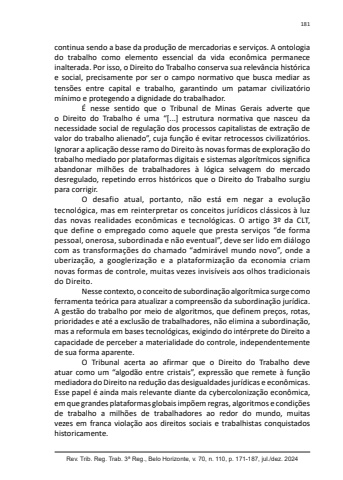 Rev. Trib. Reg. Trab. 3ª Reg., Belo Horizonte, v. 70, n. 110, p. 171-187, jul./dez. 2024181continua sendo a base da produção de mercadorias e serviços. A ontologia do trabalho como elemento essencial da vida econômica permanece inalterada. Por isso, o Direito do Trabalho conserva sua relevância histórica e social, precisamente por ser o campo normativo que busca mediar as tensões entre capital e trabalho, garantindo um patamar civilizatório mínimo e protegendo a dignidade do trabalhador.É nesse sentido que o Tribunal de Minas Gerais adverte que o Direito do Trabalho é uma “[...] estrutura normativa que nasceu da necessidade social de regulação dos processos capitalistas de extração de valor do trabalho alienado”, cuja função é evitar retrocessos civilizatórios. Ignorar a aplicação desse ramo do Direito às novas formas de exploração do trabalho mediado por plataformas digitais e sistemas algorítmicos significa abandonar milhões de trabalhadores à lógica selvagem do mercado desregulado, repetindo erros históricos que o Direito do Trabalho surgiu para corrigir.O desafio atual, portanto, não está em negar a evolução tecnológica, mas em reinterpretar os conceitos jurídicos clássicos à luz das novas realidades econômicas e tecnológicas. O artigo 3º da CLT, que define o empregado como aquele que presta serviços “de forma pessoal, onerosa, subordinada e não eventual”, deve ser lido em diálogo com as transformações do chamado “admirável mundo novo”, onde a uberização, a googlerização e a plataformização da economia criam novas formas de controle, muitas vezes invisíveis aos olhos tradicionais do Direito.Nesse contexto, o conceito de subordinação algorítmica surge como ferramenta teórica para atualizar a compreensão da subordinação jurídica. A gestão do trabalho por meio de algoritmos, que definem preços, rotas, prioridades e até a exclusão de trabalhadores, não elimina a subordinação, mas a reformula em bases tecnológicas, exigindo do intérprete do Direito a capacidade de perceber a materialidade do controle, independentemente de sua forma aparente.O Tribunal acerta ao afirmar que o Direito do Trabalho deve atuar como um “algodão entre cristais”, expressão que remete à função mediadora do Direito na redução das desigualdades jurídicas e econômicas. Esse papel é ainda mais relevante diante da cybercolonização econômica, em que grandes plataformas globais impõem regras, algoritmos e condições de trabalho a milhões de trabalhadores ao redor do mundo, muitas vezes em franca violação aos direitos sociais e trabalhistas conquistados historicamente.