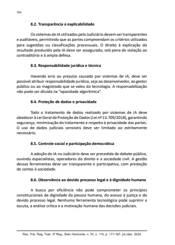 Rev. Trib. Reg. Trab. 3ª Reg., Belo Horizonte, v. 70, n. 110, p. 171-187, jul./dez. 20241848.2. Transparência e explicabilidadeOs sistemas de IA utilizados pelo Judiciário devem ser transparentes e auditáveis, permitindo que as partes compreendam os critérios utilizados para sugestões ou classificações processuais. O direito à explicação do resultado produzido pela IA deve ser assegurado, sob pena de violação ao contraditório e à ampla defesa.8.3. Responsabilidade jurídica e técnicaHavendo erro ou prejuízo causado por sistemas de IA, deve ser possível atribuir responsabilidade jurídica, seja ao desenvolvedor, ao gestor público ou ao magistrado que se valeu da tecnologia. A responsabilização não pode ser diluída na “opacidade algorítmica”.8.4. Proteção de dados e privacidadeTodo o tratamento de dados realizado por sistemas de IA deve obedecer à Lei Geral de Proteção de Dados (Lei nº 13.709/2018), garantindo segurança, minimização do tratamento e respeito à privacidade das partes. O uso de dados judiciais sensíveis deve ser limitado ao estritamente necessário.8.5. Controle social e participação democráticaA adoção de IA no Judiciário deve ser precedida de debate público, ouvindo especialistas, operadores do direito e a sociedade civil. A gestão dessas ferramentas deve ser transparente e participativa, com prestação de contas à sociedade.8.6. Observância ao devido processo legal e à dignidade humanaA busca por eficiência não pode comprometer os princípios constitucionais da dignidade da pessoa humana, do acesso à justiça e do devido processo legal. Nenhuma ferramenta tecnológica pode suprimir a escuta, a análise crítica e a motivação humana das decisões judiciais.