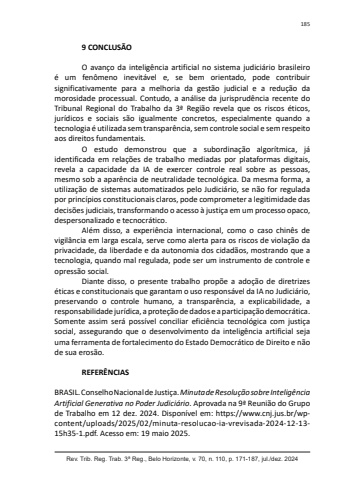 Rev. Trib. Reg. Trab. 3ª Reg., Belo Horizonte, v. 70, n. 110, p. 171-187, jul./dez. 20241859 CONCLUSÃOO avanço da inteligência artificial no sistema judiciário brasileiro é um fenômeno inevitável e, se bem orientado, pode contribuir significativamente para a melhoria da gestão judicial e a redução da morosidade processual. Contudo, a análise da jurisprudência recente do Tribunal Regional do Trabalho da 3ª Região revela que os riscos éticos, jurídicos e sociais são igualmente concretos, especialmente quando a tecnologia é utilizada sem transparência, sem controle social e sem respeito aos direitos fundamentais.O estudo demonstrou que a subordinação algorítmica, já identificada em relações de trabalho mediadas por plataformas digitais, revela a capacidade da IA de exercer controle real sobre as pessoas, mesmo sob a aparência de neutralidade tecnológica. Da mesma forma, a utilização de sistemas automatizados pelo Judiciário, se não for regulada por princípios constitucionais claros, pode comprometer a legitimidade das decisões judiciais, transformando o acesso à justiça em um processo opaco, despersonalizado e tecnocrático.Além disso, a experiência internacional, como o caso chinês de vigilância em larga escala, serve como alerta para os riscos de violação da privacidade, da liberdade e da autonomia dos cidadãos, mostrando que a tecnologia, quando mal regulada, pode ser um instrumento de controle e opressão social.Diante disso, o presente trabalho propõe a adoção de diretrizes éticas e constitucionais que garantam o uso responsável da IA no Judiciário, preservando o controle humano, a transparência, a explicabilidade, a responsabilidade jurídica, a proteção de dados e a participação democrática. Somente assim será possível conciliar eficiência tecnológica com justiça social, assegurando que o desenvolvimento da inteligência artificial seja uma ferramenta de fortalecimento do Estado Democrático de Direito e não de sua erosão.REFERÊNCIASBRASIL. Conselho Nacional de Justiça. Minuta de Resolução sobre Inteligência Artificial Generativa no Poder Judiciário. Aprovada na 9ª Reunião do Grupo de Trabalho em 12 dez. 2024. Disponível em: https://www.cnj.jus.br/wpcontent/uploads/2025/02/minuta-resolucao-ia-vrevisada-2024-12-13-15h35-1.pdf. Acesso em: 19 maio 2025.