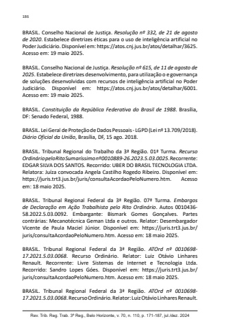 Rev. Trib. Reg. Trab. 3ª Reg., Belo Horizonte, v. 70, n. 110, p. 171-187, jul./dez. 2024186BRASIL. Conselho Nacional de Justiça. Resolução nº 332, de 21 de agosto de 2020. Estabelece diretrizes éticas para o uso de inteligência artificial no Poder Judiciário. Disponível em: https://atos.cnj.jus.br/atos/detalhar/3625. Acesso em: 19 maio 2025.BRASIL. Conselho Nacional de Justiça. Resolução nº 615, de 11 de agosto de 2025. Estabelece diretrizes desenvolvimento, para utilização o e governança de soluções desenvolvidas com recursos de inteligência artificial no Poder Judiciário. Disponível em: https://atos.cnj.jus.br/atos/detalhar/6001. Acesso em: 19 maio 2025.BRASIL. Constituição da República Federativa do Brasil de 1988. Brasília, DF: Senado Federal, 1988.BRASIL. Lei Geral de Proteção de Dados Pessoais - LGPD (Lei nº 13.709/2018). Diário Oficial da União, Brasília, DF, 15 ago. 2018.BRASIL. Tribunal Regional do Trabalho da 3ª Região. 01ª Turma. Recurso Ordinário pelo Rito Sumaríssimo nº 0010889-26.2023.5.03.0025. Recorrente: EDGAR SILVA DOS SANTOS. Recorrido: UBER DO BRASIL TECNOLOGIA LTDA. Relatora: Juíza convocada Angela Castilho Rogedo Ribeiro. Disponível em: https://juris.trt3.jus.br/juris/consultaAcordaoPeloNumero.htm. Acessoem: 18 maio 2025.BRASIL. Tribunal Regional Federal da 3ª Região. 07ª Turma. Embargos de Declaração em Ação Trabalhista pelo Rito Ordinário. Autos 0010436-58.2022.5.03.0092. Embargante: Bismark Gomes Gonçalves. Partes contrárias: Mecanotécnica Geman Ltda e outros. Relator: Desembargador Vicente de Paula Maciel Júnior. Disponível em: https://juris.trt3.jus.br/juris/consultaAcordaoPeloNumero.htm. Acesso em: 18 maio 2025.BRASIL. Tribunal Regional Federal da 3ª Região. ATOrd nº 0010698-17.2021.5.03.0068. Recurso Ordinário. Relator: Luiz Otávio Linhares Renault. Recorrente: Livre Sistemas de Internet e Tecnologia Ltda. Recorrido: Sandro Lopes Góes. Disponível em: https://juris.trt3.jus.br/juris/consultaAcordaoPeloNumero.htm. Acesso em: 18 maio 2025.BRASIL. Tribunal Regional Federal da 3ª Região. ATOrd nº 0010698-17.2021.5.03.0068. Recurso Ordinário. Relator: Luiz Otávio Linhares Renault.