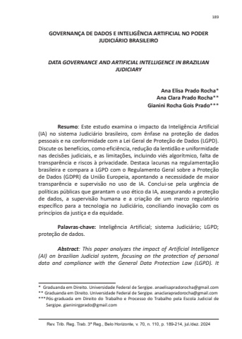 Rev. Trib. Reg. Trab. 3ª Reg., Belo Horizonte, v. 70, n. 110, p. 189-214, jul./dez. 2024189GOVERNANÇA DE DADOS E INTELIGÊNCIA ARTIFICIAL NO PODER JUDICIÁRIO BRASILEIRODATA GOVERNANCE AND ARTIFICIAL INTELLIGENCE IN BRAZILIAN JUDICIARYAna Elisa Prado Rocha*Ana Clara Prado Rocha**Gianini Rocha Gois Prado***Resumo: Este estudo examina o impacto da Inteligência Artificial (IA) no sistema Judiciário brasileiro, com ênfase na proteção de dados pessoais e na conformidade com a Lei Geral de Proteção de Dados (LGPD). Discute os benefícios, como eficiência, redução da lentidão e uniformidade nas decisões judiciais, e as limitações, incluindo viés algorítmico, falta de transparência e riscos à privacidade. Destaca lacunas na regulamentação brasileira e compara a LGPD com o Regulamento Geral sobre a Proteção de Dados (GDPR) da União Europeia, apontando a necessidade de maior transparência e supervisão no uso de IA. Conclui-se pela urgência de políticas públicas que garantam o uso ético da IA, assegurando a proteção de dados, a supervisão humana e a criação de um marco regulatório específico para a tecnologia no Judiciário, conciliando inovação com os princípios da justiça e da equidade.Palavras-chave: Inteligência Artificial; sistema Judiciário; LGPD; proteção de dados.Abstract: This paper analyzes the impact of Artificial Intelligence (AI) on brazilian Judicial system, focusing on the protection of personal data and compliance with the General Data Protection Law (LGPD). It * Graduanda em Direito. Universidade Federal de Sergipe. anaelisapradorocha@gmail.com** Graduanda em Direito. Universidade Federal de Sergipe. anaclarapradorocha@gmail.com*** Pós-graduada em Direito do Trabalho e Processo do Trabalho pela Escola Judicial de Sergipe. gianinirgprado@gmail.com
