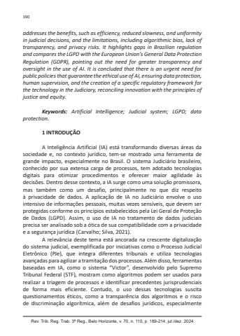 Rev. Trib. Reg. Trab. 3ª Reg., Belo Horizonte, v. 70, n. 110, p. 189-214, jul./dez. 2024190addresses the benefits, such as efficiency, reduced slowness, and uniformity in judicial decisions, and the limitations, including algorithmic bias, lack of transparency, and privacy risks. It highlights gaps in Brazilian regulation and compares the LGPD with the European Union’s General Data Protection Regulation (GDPR), pointing out the need for greater transparency and oversight in the use of AI. It is concluded that there is an urgent need for public policies that guarantee the ethical use of AI, ensuring data protection, human supervision, and the creation of a specific regulatory framework for the technology in the Judiciary, reconciling innovation with the principles of justice and equity.Keywords: Artificial Intelligence; Judicial system; LGPD; data protection. 1 INTRODUÇÃOA Inteligência Artificial (IA) está transformando diversas áreas da sociedade e, no contexto jurídico, tem-se mostrado uma ferramenta de grande impacto, especialmente no Brasil. O sistema Judiciário brasileiro, conhecido por sua extensa carga de processos, tem adotado tecnologias digitais para otimizar procedimentos e oferecer maior agilidade às decisões. Dentro desse contexto, a IA surge como uma solução promissora, mas também como um desafio, principalmente no que diz respeito à privacidade de dados. A aplicação de IA no Judiciário envolve o uso intensivo de informações pessoais, muitas vezes sensíveis, que devem ser protegidas conforme os princípios estabelecidos pela Lei Geral de Proteção de Dados (LGPD). Assim, o uso de IA no tratamento de dados judiciais precisa ser analisado sob a ótica de sua compatibilidade com a privacidade e a segurança jurídica (Carvalho; Silva, 2021).A relevância deste tema está ancorada na crescente digitalização do sistema judicial, exemplificada por iniciativas como o Processo Judicial Eletrônico (PJe), que integra diferentes tribunais e utiliza tecnologias avançadas para agilizar a tramitação dos processos. Além disso, ferramentas baseadas em IA, como o sistema “Victor”, desenvolvido pelo Supremo Tribunal Federal (STF), mostram como algoritmos podem ser usados para realizar a triagem de processos e identificar precedentes jurisprudenciais de forma mais eficiente. Contudo, o uso dessas tecnologias suscita questionamentos éticos, como a transparência dos algoritmos e o risco de discriminação algorítmica, além de desafios jurídicos, especialmente