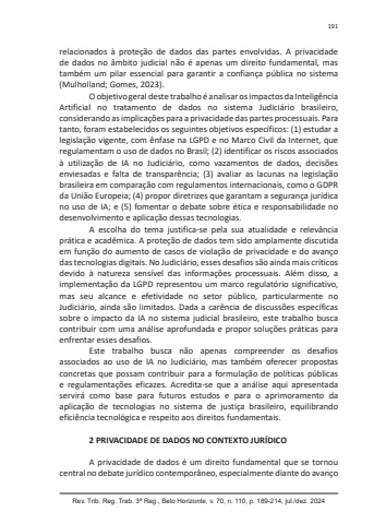 Rev. Trib. Reg. Trab. 3ª Reg., Belo Horizonte, v. 70, n. 110, p. 189-214, jul./dez. 2024191relacionados à proteção de dados das partes envolvidas. A privacidade de dados no âmbito judicial não é apenas um direito fundamental, mas também um pilar essencial para garantir a confiança pública no sistema (Mulholland; Gomes, 2023).O objetivo geral deste trabalho é analisar os impactos da Inteligência Artificial no tratamento de dados no sistema Judiciário brasileiro, considerando as implicações para a privacidade das partes processuais. Para tanto, foram estabelecidos os seguintes objetivos específicos: (1) estudar a legislação vigente, com ênfase na LGPD e no Marco Civil da Internet, que regulamentam o uso de dados no Brasil; (2) identificar os riscos associados à utilização de IA no Judiciário, como vazamentos de dados, decisões enviesadas e falta de transparência; (3) avaliar as lacunas na legislação brasileira em comparação com regulamentos internacionais, como o GDPR da União Europeia; (4) propor diretrizes que garantam a segurança jurídica no uso de IA; e (5) fomentar o debate sobre ética e responsabilidade no desenvolvimento e aplicação dessas tecnologias.A escolha do tema justifica-se pela sua atualidade e relevância prática e acadêmica. A proteção de dados tem sido amplamente discutida em função do aumento de casos de violação de privacidade e do avanço das tecnologias digitais. No Judiciário, esses desafios são ainda mais críticos devido à natureza sensível das informações processuais. Além disso, a implementação da LGPD representou um marco regulatório significativo, mas seu alcance e efetividade no setor público, particularmente no Judiciário, ainda são limitados. Dada a carência de discussões específicas sobre o impacto da IA no sistema judicial brasileiro, este trabalho busca contribuir com uma análise aprofundada e propor soluções práticas para enfrentar esses desafios.Este trabalho busca não apenas compreender os desafios associados ao uso de IA no Judiciário, mas também oferecer propostas concretas que possam contribuir para a formulação de políticas públicas e regulamentações eficazes. Acredita-se que a análise aqui apresentada servirá como base para futuros estudos e para o aprimoramento da aplicação de tecnologias no sistema de justiça brasileiro, equilibrando eficiência tecnológica e respeito aos direitos fundamentais. 2 PRIVACIDADE DE DADOS NO CONTEXTO JURÍDICOA privacidade de dados é um direito fundamental que se tornou central no debate jurídico contemporâneo, especialmente diante do avanço