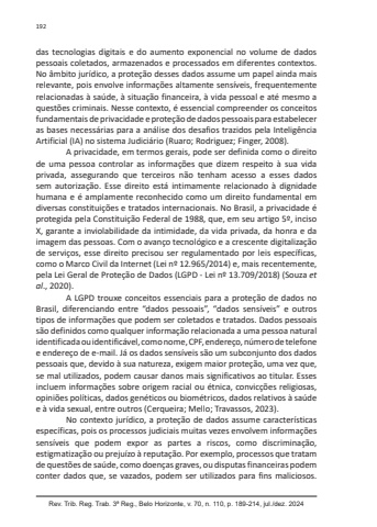 Rev. Trib. Reg. Trab. 3ª Reg., Belo Horizonte, v. 70, n. 110, p. 189-214, jul./dez. 2024192das tecnologias digitais e do aumento exponencial no volume de dados pessoais coletados, armazenados e processados em diferentes contextos. No âmbito jurídico, a proteção desses dados assume um papel ainda mais relevante, pois envolve informações altamente sensíveis, frequentemente relacionadas à saúde, à situação financeira, à vida pessoal e até mesmo a questões criminais. Nesse contexto, é essencial compreender os conceitos fundamentais de privacidade e proteção de dados pessoais para estabelecer as bases necessárias para a análise dos desafios trazidos pela Inteligência Artificial (IA) no sistema Judiciário (Ruaro; Rodriguez; Finger, 2008).A privacidade, em termos gerais, pode ser definida como o direito de uma pessoa controlar as informações que dizem respeito à sua vida privada, assegurando que terceiros não tenham acesso a esses dados sem autorização. Esse direito está intimamente relacionado à dignidade humana e é amplamente reconhecido como um direito fundamental em diversas constituições e tratados internacionais. No Brasil, a privacidade é protegida pela Constituição Federal de 1988, que, em seu artigo 5º, inciso X, garante a inviolabilidade da intimidade, da vida privada, da honra e da imagem das pessoas. Com o avanço tecnológico e a crescente digitalização de serviços, esse direito precisou ser regulamentado por leis específicas, como o Marco Civil da Internet (Lei nº 12.965/2014) e, mais recentemente, pela Lei Geral de Proteção de Dados (LGPD - Lei nº 13.709/2018) (Souza et al., 2020).A LGPD trouxe conceitos essenciais para a proteção de dados no Brasil, diferenciando entre “dados pessoais”, “dados sensíveis” e outros tipos de informações que podem ser coletados e tratados. Dados pessoais são definidos como qualquer informação relacionada a uma pessoa natural identificada ou identificável, como nome, CPF, endereço, número de telefone e endereço de e-mail. Já os dados sensíveis são um subconjunto dos dados pessoais que, devido à sua natureza, exigem maior proteção, uma vez que, se mal utilizados, podem causar danos mais significativos ao titular. Esses incluem informações sobre origem racial ou étnica, convicções religiosas, opiniões políticas, dados genéticos ou biométricos, dados relativos à saúde e à vida sexual, entre outros (Cerqueira; Mello; Travassos, 2023).No contexto jurídico, a proteção de dados assume características específicas, pois os processos judiciais muitas vezes envolvem informações sensíveis que podem expor as partes a riscos, como discriminação, estigmatização ou prejuízo à reputação. Por exemplo, processos que tratam de questões de saúde, como doenças graves, ou disputas financeiras podem conter dados que, se vazados, podem ser utilizados para fins maliciosos.