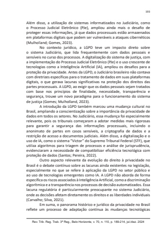 Rev. Trib. Reg. Trab. 3ª Reg., Belo Horizonte, v. 70, n. 110, p. 189-214, jul./dez. 2024193Além disso, a utilização de sistemas informatizados no Judiciário, como o Processo Judicial Eletrônico (PJe), ampliou ainda mais o desafio de proteger essas informações, já que dados processuais estão armazenados em plataformas digitais que podem ser vulneráveis a ataques cibernéticos (Mulholland; Gomes, 2023).No contexto jurídico, a LGPD teve um impacto direto sobre o sistema Judiciário, que lida frequentemente com dados pessoais e sensíveis no curso dos processos. A digitalização do sistema de justiça, com a implementação do Processo Judicial Eletrônico (PJe) e o uso crescente de tecnologias como a Inteligência Artificial (IA), ampliou os desafios para a proteção da privacidade. Antes da LGPD, o Judiciário brasileiro não contava com diretrizes específicas para o tratamento de dados em suas plataformas digitais, o que gerava lacunas significativas na proteção dos direitos das partes processuais. A LGPD, ao exigir que os dados pessoais sejam tratados com base nos princípios de finalidade, necessidade, transparência e segurança, trouxe um novo paradigma para o funcionamento do sistema de justiça (Gomes; Mulholland, 2023).A introdução da LGPD também marcou uma mudança cultural no Brasil, ampliando a conscientização sobre a importância da privacidade de dados em todos os setores. No Judiciário, essa mudança foi especialmente relevante, pois os tribunais começaram a adotar medidas mais rigorosas para garantir a segurança das informações processuais, incluindo o anonimato de partes em casos sensíveis, a criptografia de dados e a restrição de acesso a documentos judiciais. Além disso, a digitalização e o uso de IA, como o sistema “Victor” do Supremo Tribunal Federal (STF), que utiliza algoritmos para triagem de processos e análise de jurisprudência, evidenciaram a necessidade de compatibilizar eficiência tecnológica com proteção de dados (Santos; Pereira, 2022).Outro aspecto relevante da evolução do direito à privacidade no Brasil é o debate contínuo sobre as lacunas ainda existentes na legislação, especialmente no que se refere à aplicação da LGPD no setor público e ao uso de tecnologias emergentes como IA. A LGPD não aborda de forma específica os riscos associados à Inteligência Artificial, como a discriminação algorítmica e a transparência nos processos de decisão automatizados. Essa lacuna regulatória é particularmente preocupante no sistema Judiciário, onde as decisões afetam diretamente os direitos e as liberdades individuais (Carvalho; Silva, 2021).Em suma, o panorama histórico e jurídico da privacidade no Brasil reflete um processo de adaptação contínua às mudanças tecnológicas