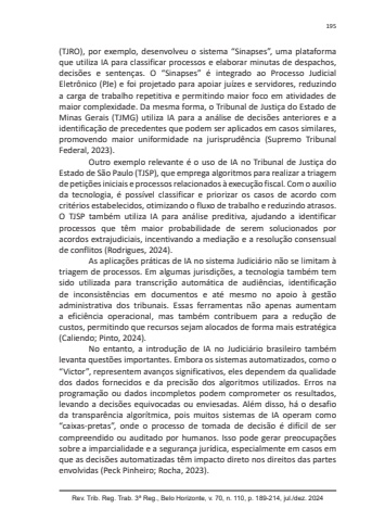 Rev. Trib. Reg. Trab. 3ª Reg., Belo Horizonte, v. 70, n. 110, p. 189-214, jul./dez. 2024195(TJRO), por exemplo, desenvolveu o sistema “Sinapses”, uma plataforma que utiliza IA para classificar processos e elaborar minutas de despachos, decisões e sentenças. O “Sinapses” é integrado ao Processo Judicial Eletrônico (PJe) e foi projetado para apoiar juízes e servidores, reduzindo a carga de trabalho repetitiva e permitindo maior foco em atividades de maior complexidade. Da mesma forma, o Tribunal de Justiça do Estado de Minas Gerais (TJMG) utiliza IA para a análise de decisões anteriores e a identificação de precedentes que podem ser aplicados em casos similares, promovendo maior uniformidade na jurisprudência (Supremo Tribunal Federal, 2023).Outro exemplo relevante é o uso de IA no Tribunal de Justiça do Estado de São Paulo (TJSP), que emprega algoritmos para realizar a triagem de petições iniciais e processos relacionados à execução fiscal. Com o auxílio da tecnologia, é possível classificar e priorizar os casos de acordo com critérios estabelecidos, otimizando o fluxo de trabalho e reduzindo atrasos. O TJSP também utiliza IA para análise preditiva, ajudando a identificar processos que têm maior probabilidade de serem solucionados por acordos extrajudiciais, incentivando a mediação e a resolução consensual de conflitos (Rodrigues, 2024).As aplicações práticas de IA no sistema Judiciário não se limitam à triagem de processos. Em algumas jurisdições, a tecnologia também tem sido utilizada para transcrição automática de audiências, identificação de inconsistências em documentos e até mesmo no apoio à gestão administrativa dos tribunais. Essas ferramentas não apenas aumentam a eficiência operacional, mas também contribuem para a redução de custos, permitindo que recursos sejam alocados de forma mais estratégica (Caliendo; Pinto, 2024).No entanto, a introdução de IA no Judiciário brasileiro também levanta questões importantes. Embora os sistemas automatizados, como o “Victor”, representem avanços significativos, eles dependem da qualidade dos dados fornecidos e da precisão dos algoritmos utilizados. Erros na programação ou dados incompletos podem comprometer os resultados, levando a decisões equivocadas ou enviesadas. Além disso, há o desafio da transparência algorítmica, pois muitos sistemas de IA operam como “caixas-pretas”, onde o processo de tomada de decisão é difícil de ser compreendido ou auditado por humanos. Isso pode gerar preocupações sobre a imparcialidade e a segurança jurídica, especialmente em casos em que as decisões automatizadas têm impacto direto nos direitos das partes envolvidas (Peck Pinheiro; Rocha, 2023).