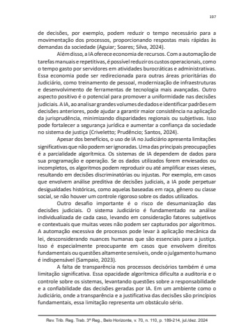 Rev. Trib. Reg. Trab. 3ª Reg., Belo Horizonte, v. 70, n. 110, p. 189-214, jul./dez. 2024197de decisões, por exemplo, podem reduzir o tempo necessário para a movimentação dos processos, proporcionando respostas mais rápidas às demandas da sociedade (Aguiar; Soares; Silva, 2024).Além disso, a IA oferece economia de recursos. Com a automação de tarefas manuais e repetitivas, é possível reduzir os custos operacionais, como o tempo gasto por servidores em atividades burocráticas e administrativas. Essa economia pode ser redirecionada para outras áreas prioritárias do Judiciário, como treinamento de pessoal, modernização de infraestruturas e desenvolvimento de ferramentas de tecnologia mais avançadas. Outro aspecto positivo é o potencial para promover a uniformidade nas decisões judiciais. A IA, ao analisar grandes volumes de dados e identificar padrões em decisões anteriores, pode ajudar a garantir maior consistência na aplicação da jurisprudência, minimizando disparidades regionais ou subjetivas. Isso pode fortalecer a segurança jurídica e aumentar a confiança da sociedade no sistema de justiça (Criveletto; Prudêncio; Santos, 2024).Apesar dos benefícios, o uso de IA no Judiciário apresenta limitações significativas que não podem ser ignoradas. Uma das principais preocupações é a parcialidade algorítmica. Os sistemas de IA dependem de dados para sua programação e operação. Se os dados utilizados forem enviesados ou incompletos, os algoritmos podem reproduzir ou até amplificar esses vieses, resultando em decisões discriminatórias ou injustas. Por exemplo, em casos que envolvem análise preditiva de decisões judiciais, a IA pode perpetuar desigualdades históricas, como aquelas baseadas em raça, gênero ou classe social, se não houver um controle rigoroso sobre os dados utilizados.Outro desafio importante é o risco de desumanização das decisões judiciais. O sistema Judiciário é fundamentado na análise individualizada de cada caso, levando em consideração fatores subjetivos e contextuais que muitas vezes não podem ser capturados por algoritmos. A automação excessiva de processos pode levar à aplicação mecânica da lei, desconsiderando nuances humanas que são essenciais para a justiça. Isso é especialmente preocupante em casos que envolvem direitos fundamentais ou questões altamente sensíveis, onde o julgamento humano é indispensável (Sampaio, 2023).A falta de transparência nos processos decisórios também é uma limitação significativa. Essa opacidade algorítmica dificulta a auditoria e o controle sobre os sistemas, levantando questões sobre a responsabilidade e a confiabilidade das decisões geradas por IA. Em um ambiente como o Judiciário, onde a transparência e a justificativa das decisões são princípios fundamentais, essa limitação representa um obstáculo sério.