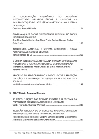 Rev. Trib. Reg. Trab. 3ª Reg., Belo Horizonte, v. 70, n. 110, p. 19-23, jul./dez. 2024DA SUBORDINAÇÃO ALGORÍTMICA AO JUDICIÁRIO AUTOMATIZADO: DESAFIOS ÉTICOS E JURÍDICOS NA IMPLEMENTAÇÃO DA INTELIGÊNCIA ARTIFICIAL NO SISTEMA DE JUSTIÇACassiano Pastori Filarde ......................................................................171GOVERNANÇA DE DADOS E INTELIGÊNCIA ARTIFICIAL NO PODER JUDICIÁRIO BRASILEIROAna Elisa Prado Rocha, Ana Clara Prado Rocha, Gianini RochaGois Prado ..........................................................................................189INTELIGÊNCIA ARTIFICIAL E SISTEMA JUDICIÁRIO - NOVAS PERSPECTIVAS E ANTIGOS DESAFIOSKarine Borges de Liz ...........................................................................215O USO DA INTELIGÊNCIA ARTIFICIAL NA TRIAGEM E PRIORIZAÇÃO PROCESSUAL: EFICIÊNCIA VERSUS RISCO DE DISCRIMINAÇÃOMorganna Aparecida Maia Chaves de Lima, Maria CarolinaBezerra Falcão ....................................................................................237PROCESSO EM REDE ORIENTADO A DADOS: ENTRE A REPETIÇÃO DO JUÍZO E A DIFERENÇA DA JUSTIÇA NA ERA DO BIG DATA FORENSEJosé Eduardo de Resende Chaves Júnior ............................................2593 DOUTRINAS - Assuntos DiversosAS CINCO FUNÇÕES DAS NORMAS ESTATAIS E O SOFISMA DA PREVALÊNCIA DO NEGOCIADO SOBRE O LEGISLADOValdir Florindo, Thomaz Werneck ......................................................307INCLUSÃO RELIGIOSA DO 2º CONCURS0 NACIONAL UNIFICADO PARA INGRESSO NA MAGISTRATURA DO TRABALHOHenrique Mussio Fornazier Volpini, Vinícius Eduardo Granemann,Jeisi Mara Guilherme Lanzarini Granemann.......................................327