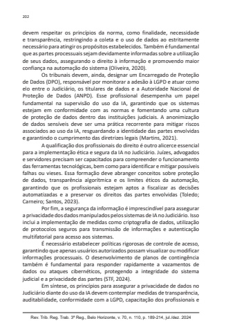 Rev. Trib. Reg. Trab. 3ª Reg., Belo Horizonte, v. 70, n. 110, p. 189-214, jul./dez. 2024202devem respeitar os princípios da norma, como finalidade, necessidade e transparência, restringindo a coleta e o uso de dados ao estritamente necessário para atingir os propósitos estabelecidos. Também é fundamental que as partes processuais sejam devidamente informadas sobre a utilização de seus dados, assegurando o direito à informação e promovendo maior confiança na automação do sistema (Oliveira, 2020).Os tribunais devem, ainda, designar um Encarregado de Proteção de Dados (DPO), responsável por monitorar a adesão à LGPD e atuar como elo entre o Judiciário, os titulares de dados e a Autoridade Nacional de Proteção de Dados (ANPD). Esse profissional desempenha um papel fundamental na supervisão do uso da IA, garantindo que os sistemas estejam em conformidade com as normas e fomentando uma cultura de proteção de dados dentro das instituições judiciais. A anonimização de dados sensíveis deve ser uma prática recorrente para mitigar riscos associados ao uso da IA, resguardando a identidade das partes envolvidas e garantindo o cumprimento das diretrizes legais (Martins, 2021).A qualificação dos profissionais do direito é outro alicerce essencial para a implementação ética e segura da IA no Judiciário. Juízes, advogados e servidores precisam ser capacitados para compreender o funcionamento das ferramentas tecnológicas, bem como para identificar e mitigar possíveis falhas ou vieses. Essa formação deve abranger conceitos sobre proteção de dados, transparência algorítmica e os limites éticos da automação, garantindo que os profissionais estejam aptos a fiscalizar as decisões automatizadas e a preservar os direitos das partes envolvidas (Toledo; Carneiro; Santos, 2023).Por fim, a segurança da informação é imprescindível para assegurar a privacidade dos dados manipulados pelos sistemas de IA no Judiciário. Isso inclui a implementação de medidas como criptografia de dados, utilização de protocolos seguros para transmissão de informações e autenticação multifatorial para acesso aos sistemas.É necessário estabelecer políticas rigorosas de controle de acesso, garantindo que apenas usuários autorizados possam visualizar ou modificar informações processuais. O desenvolvimento de planos de contingência também é fundamental para responder rapidamente a vazamentos de dados ou ataques cibernéticos, protegendo a integridade do sistema judicial e a privacidade das partes (STF, 2024).Em síntese, os princípios para assegurar a privacidade de dados no Judiciário diante do uso da IA devem contemplar medidas de transparência, auditabilidade, conformidade com a LGPD, capacitação dos profissionais e