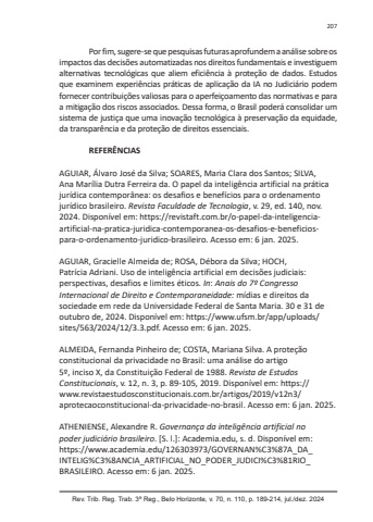 Rev. Trib. Reg. Trab. 3ª Reg., Belo Horizonte, v. 70, n. 110, p. 189-214, jul./dez. 2024207Por fim, sugere-se que pesquisas futuras aprofundem a análise sobre os impactos das decisões automatizadas nos direitos fundamentais e investiguem alternativas tecnológicas que aliem eficiência à proteção de dados. Estudos que examinem experiências práticas de aplicação da IA no Judiciário podem fornecer contribuições valiosas para o aperfeiçoamento das normativas e para a mitigação dos riscos associados. Dessa forma, o Brasil poderá consolidar um sistema de justiça que uma inovação tecnológica à preservação da equidade, da transparência e da proteção de direitos essenciais. REFERÊNCIASAGUIAR, Álvaro José da Silva; SOARES, Maria Clara dos Santos; SILVA, Ana Marília Dutra Ferreira da. O papel da inteligência artificial na prática jurídica contemporânea: os desafios e benefícios para o ordenamento jurídico brasileiro. Revista Faculdade de Tecnologia, v. 29, ed. 140, nov. 2024. Disponível em: https://revistaft.com.br/o-papel-da-inteligenciaartificial-na-pratica-juridica-contemporanea-os-desafios-e-beneficiospara-o-ordenamento-juridico-brasileiro. Acesso em: 6 jan. 2025.AGUIAR, Gracielle Almeida de; ROSA, Débora da Silva; HOCH, Patrícia Adriani. Uso de inteligência artificial em decisões judiciais: perspectivas, desafios e limites éticos. In: Anais do 7º Congresso Internacional de Direito e Contemporaneidade: mídias e direitos da sociedade em rede da Universidade Federal de Santa Maria. 30 e 31 de outubro de, 2024. Disponível em: https://www.ufsm.br/app/uploads/sites/563/2024/12/3.3.pdf. Acesso em: 6 jan. 2025.ALMEIDA, Fernanda Pinheiro de; COSTA, Mariana Silva. A proteção constitucional da privacidade no Brasil: uma análise do artigo 5º, inciso X, da Constituição Federal de 1988. Revista de Estudos Constitucionais, v. 12, n. 3, p. 89-105, 2019. Disponível em: https://www.revistaestudosconstitucionais.com.br/artigos/2019/v12n3/aprotecaoconstitucional-da-privacidade-no-brasil. Acesso em: 6 jan. 2025.ATHENIENSE, Alexandre R. Governança da inteligência artificial no poder judiciário brasileiro. [S. l.]: Academia.edu, s. d. Disponível em: https://www.academia.edu/126303973/GOVERNAN%C3%87A_DA_INTELIG%C3%8ANCIA_ARTIFICIAL_NO_PODER_JUDICI%C3%81RIO_BRASILEIRO. Acesso em: 6 jan. 2025.