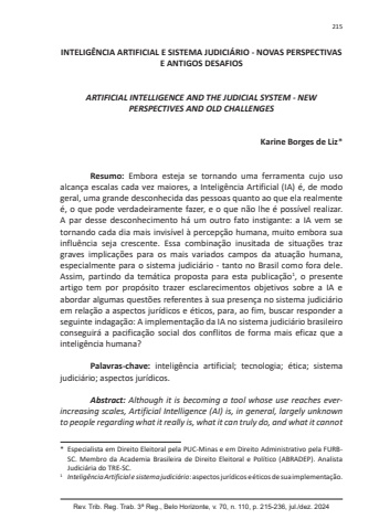 Rev. Trib. Reg. Trab. 3ª Reg., Belo Horizonte, v. 70, n. 110, p. 215-236, jul./dez. 2024215INTELIGÊNCIA ARTIFICIAL E SISTEMA JUDICIÁRIO - NOVAS PERSPECTIVAS E ANTIGOS DESAFIOSARTIFICIAL INTELLIGENCE AND THE JUDICIAL SYSTEM - NEW PERSPECTIVES AND OLD CHALLENGESKarine Borges de Liz*Resumo: Embora esteja se tornando uma ferramenta cujo uso alcança escalas cada vez maiores, a Inteligência Artificial (IA) é, de modo geral, uma grande desconhecida das pessoas quanto ao que ela realmente é, o que pode verdadeiramente fazer, e o que não lhe é possível realizar. A par desse desconhecimento há um outro fato instigante: a IA vem se tornando cada dia mais invisível à percepção humana, muito embora sua influência seja crescente. Essa combinação inusitada de situações traz graves implicações para os mais variados campos da atuação humana, especialmente para o sistema judiciário - tanto no Brasil como fora dele. Assim, partindo da temática proposta para esta publicação1, o presente artigo tem por propósito trazer esclarecimentos objetivos sobre a IA e abordar algumas questões referentes à sua presença no sistema judiciário em relação a aspectos jurídicos e éticos, para, ao fim, buscar responder a seguinte indagação: A implementação da IA no sistema judiciário brasileiro conseguirá a pacificação social dos conflitos de forma mais eficaz que a inteligência humana?Palavras-chave: inteligência artificial; tecnologia; ética; sistema judiciário; aspectos jurídicos.Abstract: Although it is becoming a tool whose use reaches everincreasing scales, Artificial Intelligence (AI) is, in general, largely unknown to people regarding what it really is, what it can truly do, and what it cannot * Especialista em Direito Eleitoral pela PUC-Minas e em Direito Administrativo pela FURBSC. Membro da Academia Brasileira de Direito Eleitoral e Político (ABRADEP). Analista Judiciária do TRE-SC. 1 Inteligência Artificial e sistema judiciário: aspectos jurídicos e éticos de sua implementação.