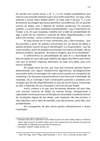 Rev. Trib. Reg. Trab. 3ª Reg., Belo Horizonte, v. 70, n. 110, p. 215-236, jul./dez. 2024219De acordo com Cunha Júnior, a IA “[...] é um modelo probabilístico que retorna uma previsão estatística para uma tarefa específica”. Ou seja, como explicita o jurista Fabro Steibel (2025), IA nada mais é do que “[...] uma ferramenta tecnológica que busca identificar coincidências, em um grande volume de dados, com o objetivo de resolver problemas. Ela encontra padrões, e a partir deles estabelece probabilidades”. Isso é importante ser frisado: a IA, em suas respostas, trabalha com a ideia de probabilidade de algo a partir de um sistema e conjunto de dados disponibilizados, e não sobre uma certeza - como a maioria das pessoas supõe.As duas formas de IA mais conhecidas são: a discriminativa - que faz previsões a partir de padrões encontrados em um banco de dados e aponta escolhas a partir do que é identificado8; e a (2) generativa - que faz novas versões a partir de padrões encontrados num banco de dados. São os diversos modelos “geradores” de textos e imagens, que há na atualidade9.O calibramento ou calculabilidade de cada IA e a diversidade da base de dados em que cada qual trabalha são alguns dos fatores que fazem com que se tenham respostas diferentes, de cada uma delas, para uma mesma questão.No estado atual da arte, por mais que inúmeras pessoas fiquem deslumbradas com alguns malabarismos algorítmicos, estrategicamente anunciados tanto em postagens de redes sociais quanto em campanhas de marketing, a IA não possui autoconsciência e nem atua com criatividade. Na realidade, ela se restringe a fazer combinações possíveis e prováveis com os dados que lhe são disponibilizados ou que ela vai em busca, licitamente ou não, a depender de sua concepção e recursos de que dispõe.Assim, embora a IA seja uma ferramenta bastante útil para lidar com imensos volumes de dados ao mesmo tempo, ultrapassando a capacidade humana para essa verificação em velocidade e estabelecimento de correlações lógicas de tais dados, suas respostas não são precisas, e não trabalham com a ideia de exatidão, mas tão somente, como dito, com probabilidades.Por conseguinte, há dois outros pontos relevantíssimos a serem ressaltados.8 Exemplos dela são os aplicativos como Waze (a partir de vários dados indica as melhores rotas), Uber (a partir de dados indica qual o carro disponível mais próximo do ponto de solicitação), IA utilizadas para previsão do tempo etc. 9 Exemplos: ChatGPT, Sabiá, Gemini, etc.