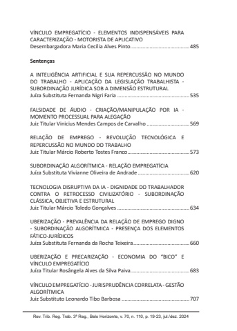 Rev. Trib. Reg. Trab. 3ª Reg., Belo Horizonte, v. 70, n. 110, p. 19-23, jul./dez. 2024VÍNCULO EMPREGATÍCIO - ELEMENTOS INDISPENSÁVEIS PARA CARACTERIZAÇÃO - MOTORISTA DE APLICATIVODesembargadora Maria Cecília Alves Pinto ........................................485SentençasA INTELIGÊNCIA ARTIFICIAL E SUA REPERCUSSÃO NO MUNDO DO TRABALHO - APLICAÇÃO DA LEGISLAÇÃO TRABALHISTA - SUBORDINAÇÃO JURÍDICA SOB A DIMENSÃO ESTRUTURALJuíza Substituta Fernanda Nigri Faria .................................................535FALSIDADE DE ÁUDIO - CRIAÇÃO/MANIPULAÇÃO POR IA - MOMENTO PROCESSUAL PARA ALEGAÇÃOJuiz Titular Vinicius Mendes Campos de Carvalho .............................569RELAÇÃO DE EMPREGO - REVOLUÇÃO TECNOLÓGICA E REPERCUSSÃO NO MUNDO DO TRABALHOJuiz Titular Márcio Roberto Tostes Franco ..........................................573SUBORDINAÇÃO ALGORÍTMICA - RELAÇÃO EMPREGATÍCIAJuíza Substituta Vivianne Oliveira de Andrade ...................................620TECNOLOGIA DISRUPTIVA DA IA - DIGNIDADE DO TRABALHADOR CONTRA O RETROCESSO CIVILIZATÓRIO - SUBORDINAÇÃO CLÁSSICA, OBJETIVA E ESTRUTURALJuiz Titular Márcio Toledo Gonçalves .................................................634UBERIZAÇÃO - PREVALÊNCIA DA RELAÇÃO DE EMPREGO DIGNO - SUBORDINAÇÃO ALGORÍTMICA - PRESENÇA DOS ELEMENTOS FÁTICO-JURÍDICOSJuíza Substituta Fernanda da Rocha Teixeira ......................................660UBERIZAÇÃO E PRECARIZAÇÃO - ECONOMIA DO “BICO” E VÍNCULO EMPREGATÍCIOJuíza Titular Rosângela Alves da Silva Paiva ........................................683VÍNCULO EMPREGATÍCIO - JURISPRUDÊNCIA CORRELATA - GESTÃO ALGORÍTMICAJuiz Substituto Leonardo Tibo Barbosa ..............................................707